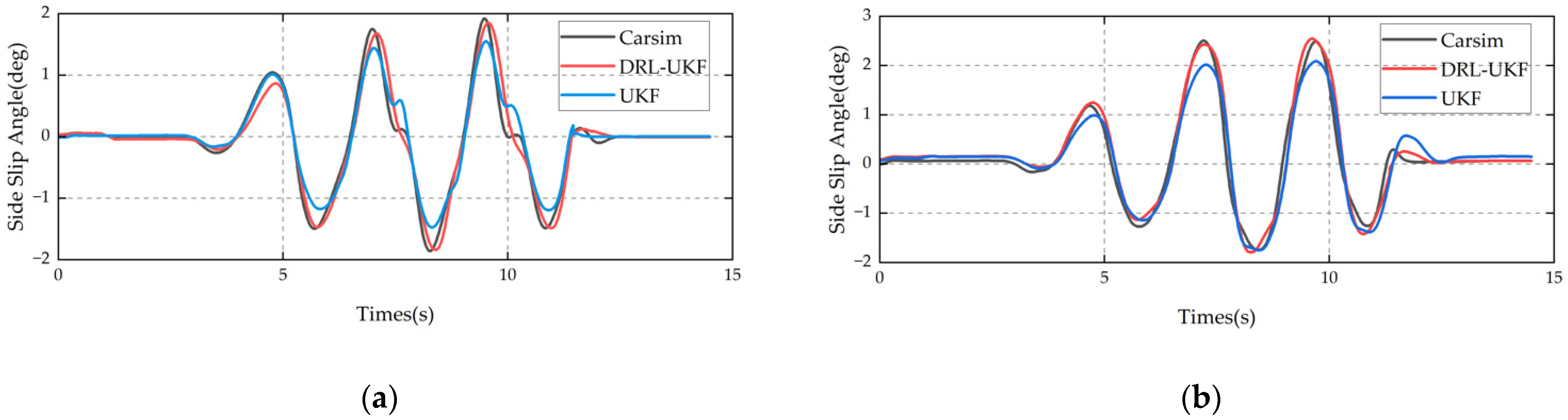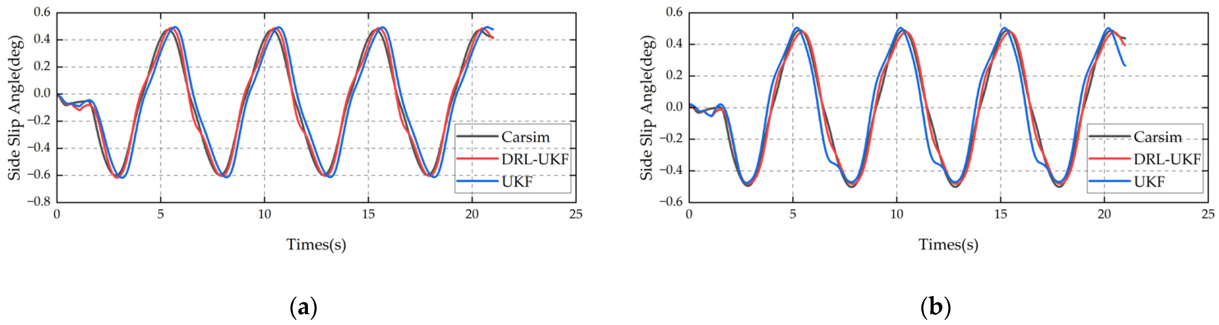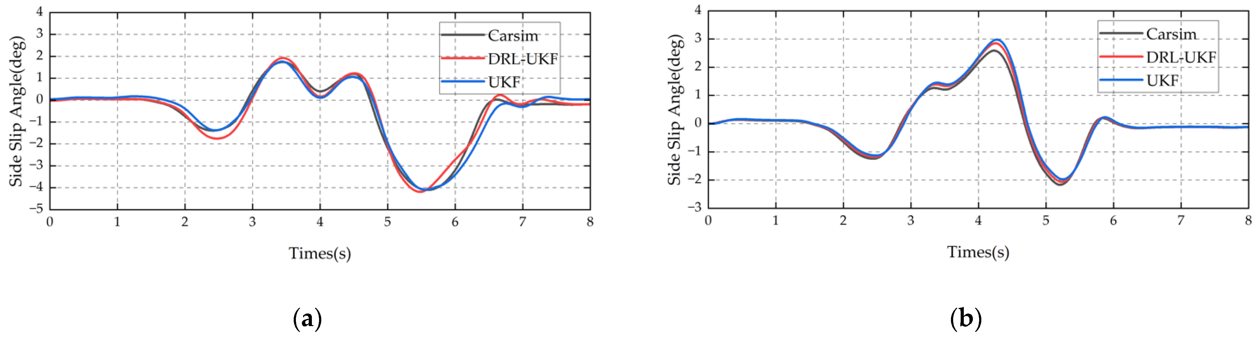 - The effectiveness and robustness of the proposed method are verified through virtual simulations and real-vehicle tests. Under various typical operating conditions, such as slalom, double-lane change, and sinusoidal steering, the sideslip angle estimation accuracy of the proposed DRL-UKF method is significantly better than that of the traditional UKF. Both the evaluation error and Root Mean Square Error are greatly improved, and stable estimation is still maintained under extreme scenarios such as low-adhesion roads and high-speed steering.