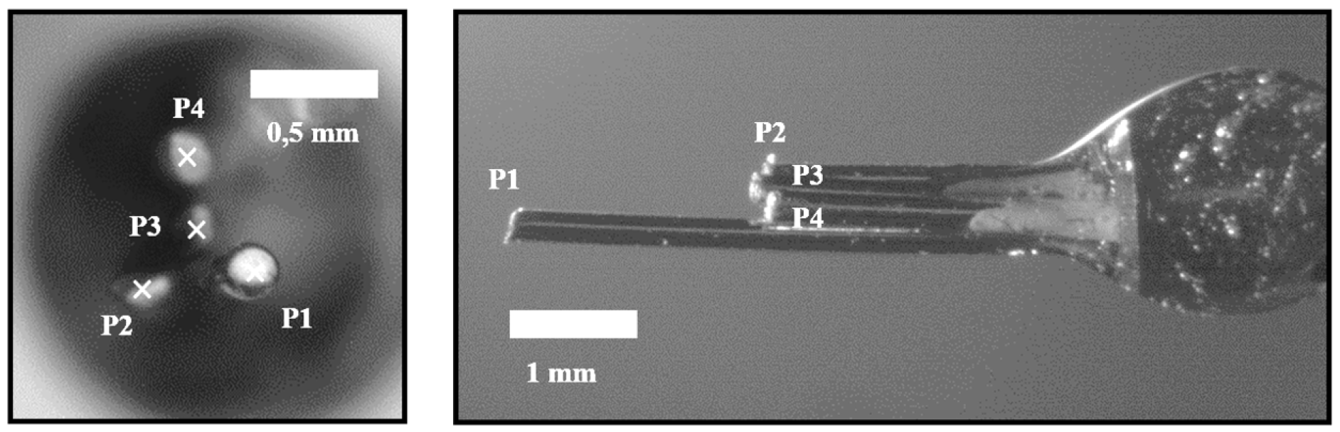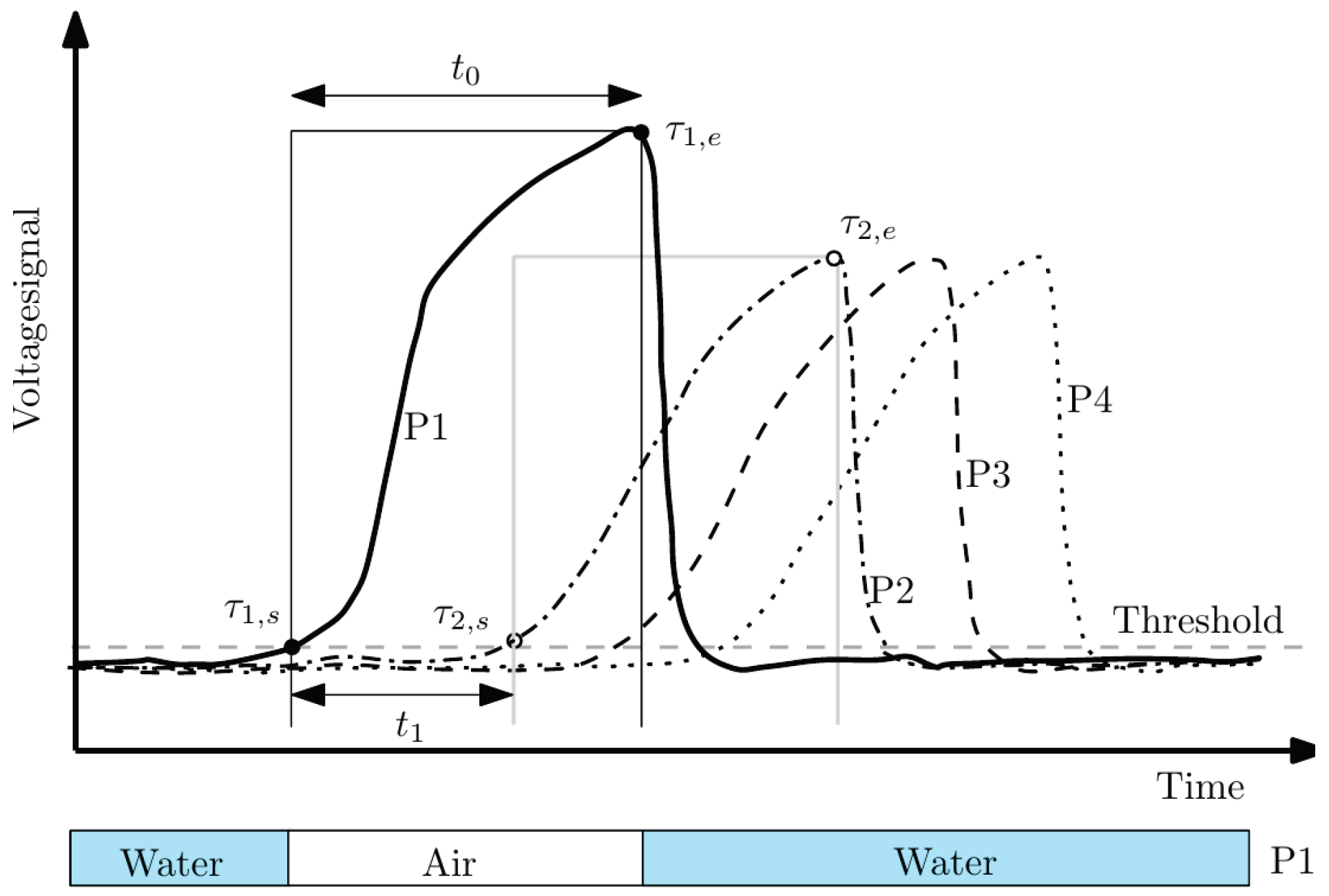 - Assuming a constant bubble velocity during the bubble–probe interaction, the sensor-tip trajectories are aligned with the Z-axis. If we define the point where the k-th tip contacts the bubble surface as , the four time delays in follow from:Recalling Equation (14), the contact times arewhere the ± sign corresponds to the two possible intersections of the tip trajectory with the ellipsoidal surface (entry and exit).
