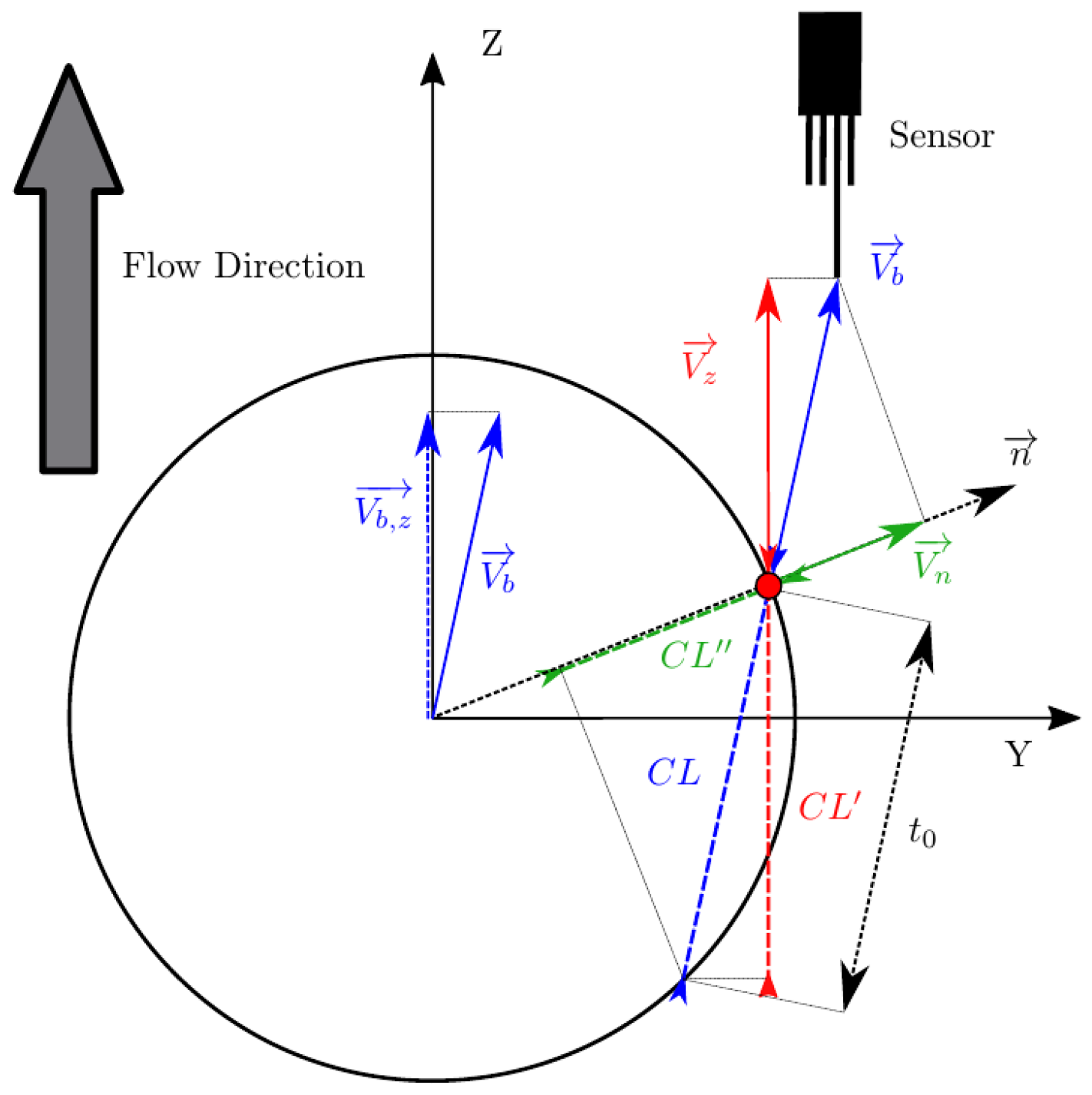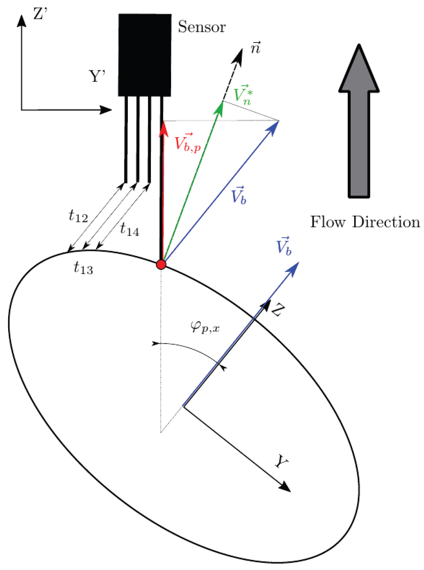 - To date, from the available methods to recover bubble velocity by using four-sensor probes (Equations (12) and (13)), we cannot account for the bubble centroid velocity, . Four-sensor probes are limited to two velocity modulus projections measurements, along the sensor probe axis, , or along the normal to surface direction, , and its components.