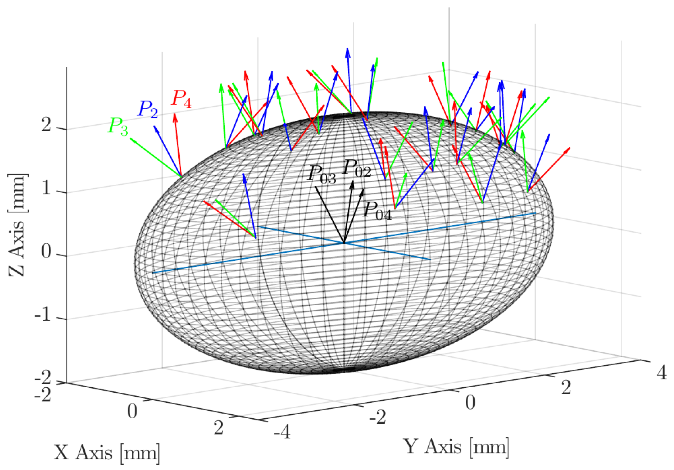 - Once inclination and rotation angles are defined, the final probe sensor k-th rear tip position, (), is obtained by means of a general homogeneous transformation matrix H:where the three rotation matrices are defined asand the translation matrix is defined asTherefore, the final rear sensor position will beNote that only the first three elements of account for its spatial location definition. Figure 9 illustrates this procedure to re-orient the probe sensor tips over an arbitrary ellipsoid surface based on and inputs, in this case for and 20 sample locations (iterations).