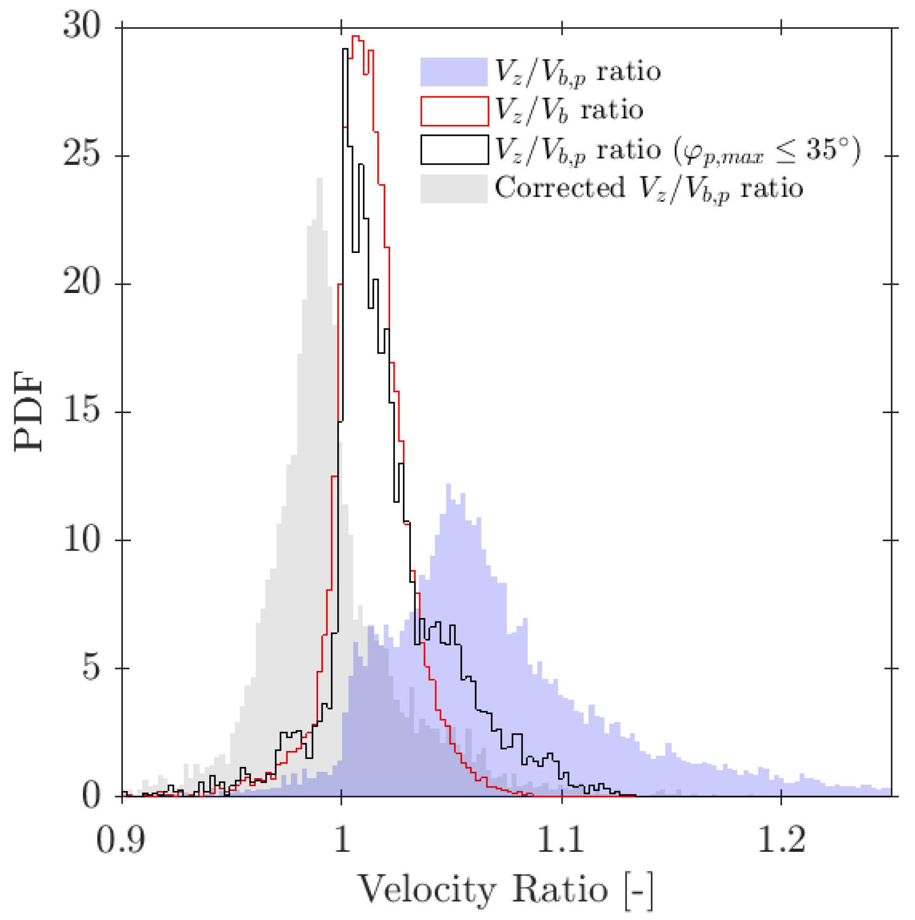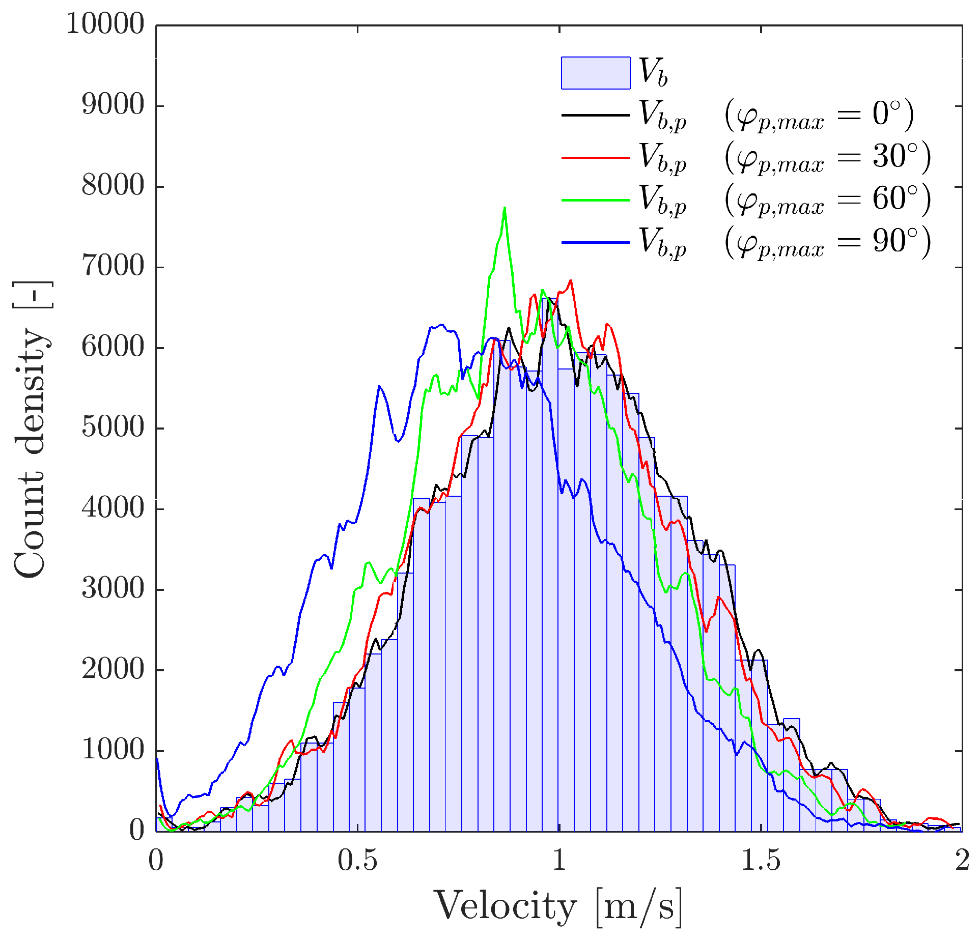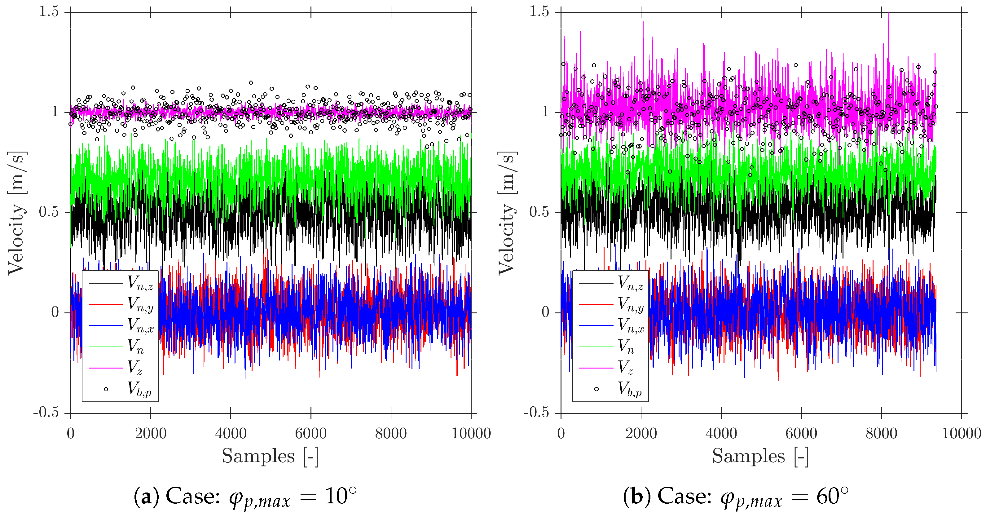 - : the bubble centroid velocity projection over the actual sensor probe axis. It is obtained by applying double homogeneous rotation over and a dot product over the Z-axis unitary vector ():The correct evaluation of from probe sensors is especially important in real measurements. Usually, in pipe flow measurements the sensor is aligned with pipe (flow) direction. In this situation, corresponds to local flux velocity to be integrated with local void fraction for gas flow-rate measurement and is therefore compared against the flow-meter reading [7,26,27,36,37]. In this sense, it is important to remark that depends on the bubble radial fluctuation, defined by . As illustrated in Figure 12, given a probability density function (PDF), the corresponding velocity PDF in the probe axis projection, velocity observed from the point of view of the virtual probe sensor, is underestimated as increases. Therefore, both velocities, and , should be evaluated separately because of their differing significance.