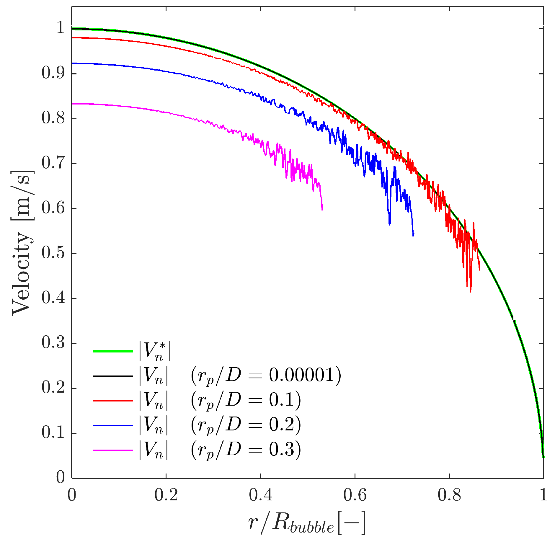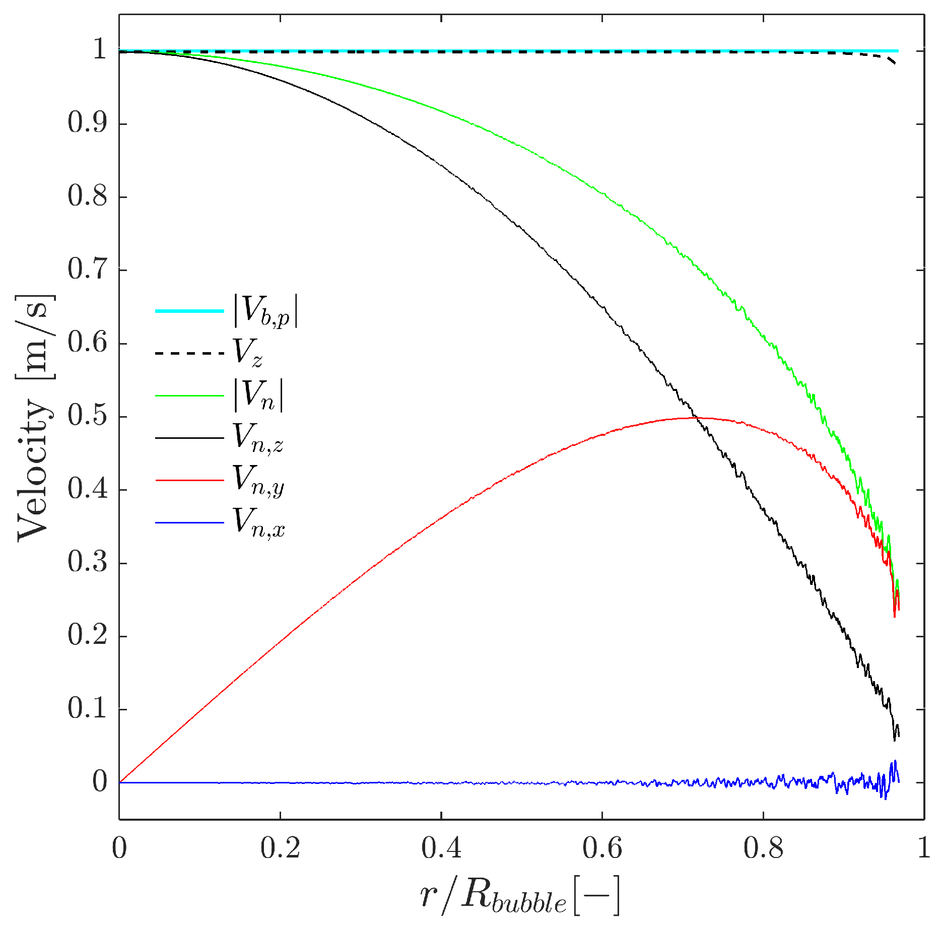 - : exact interfacial velocity obtained as the projection of over the normal to surface vector at the contact point. The normal to surface vector is obtained analytically from the surface equation and the bubble–sensor contact point individual locations.