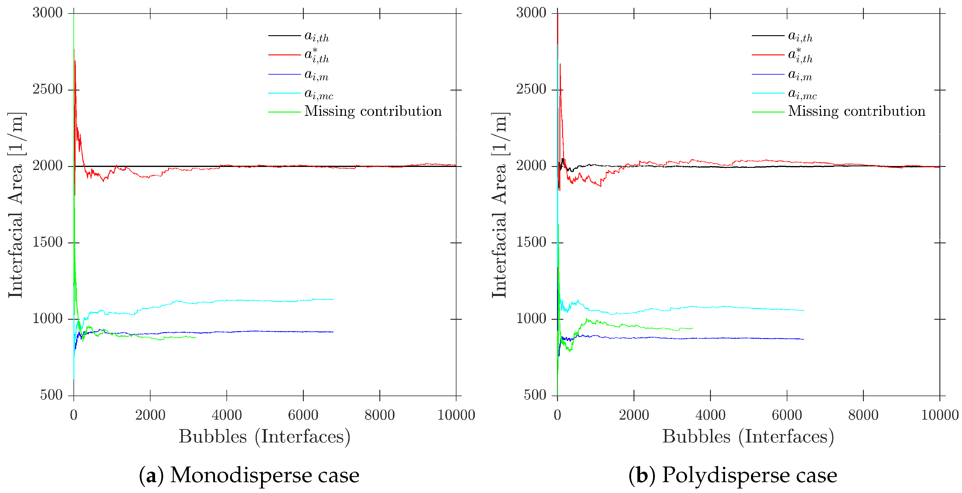 - : obtained by means of Equation (3), where the normal to surface vector is computed analytically given the bubble–probe impact point . In other words, it is the value for computed by means of . The represents the ideally measured time-averaged local interfacial area, as long as it considers all bubbles simulated: