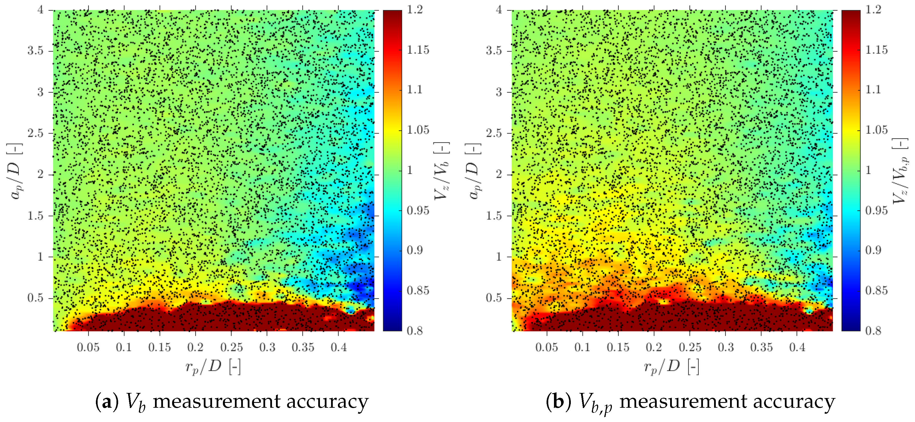 - Velocity measurements. The analysis clarifies the role of the different velocity definitions. The interfacial velocity (Equation (13)) is mainly suitable for interfacial-area estimation. In contrast, the axial velocity (Equation (12)) emerges as the most reliable estimator of both the bubble centroid velocity and its projection along the probe axis . Within the recommended geometric range and for moderate incidence angles (e.g., ), relative errors in and remain typically within . When the spread of incidence angles is increased (e.g., ), the velocity error can grow beyond even for favourable geometries, reflecting the kinematic limitations of four-sensor probes in highly oblique bubbly flows. A compact correction factor is proposed to recover the flux velocity from under a wide range of bubbly flow conditions.