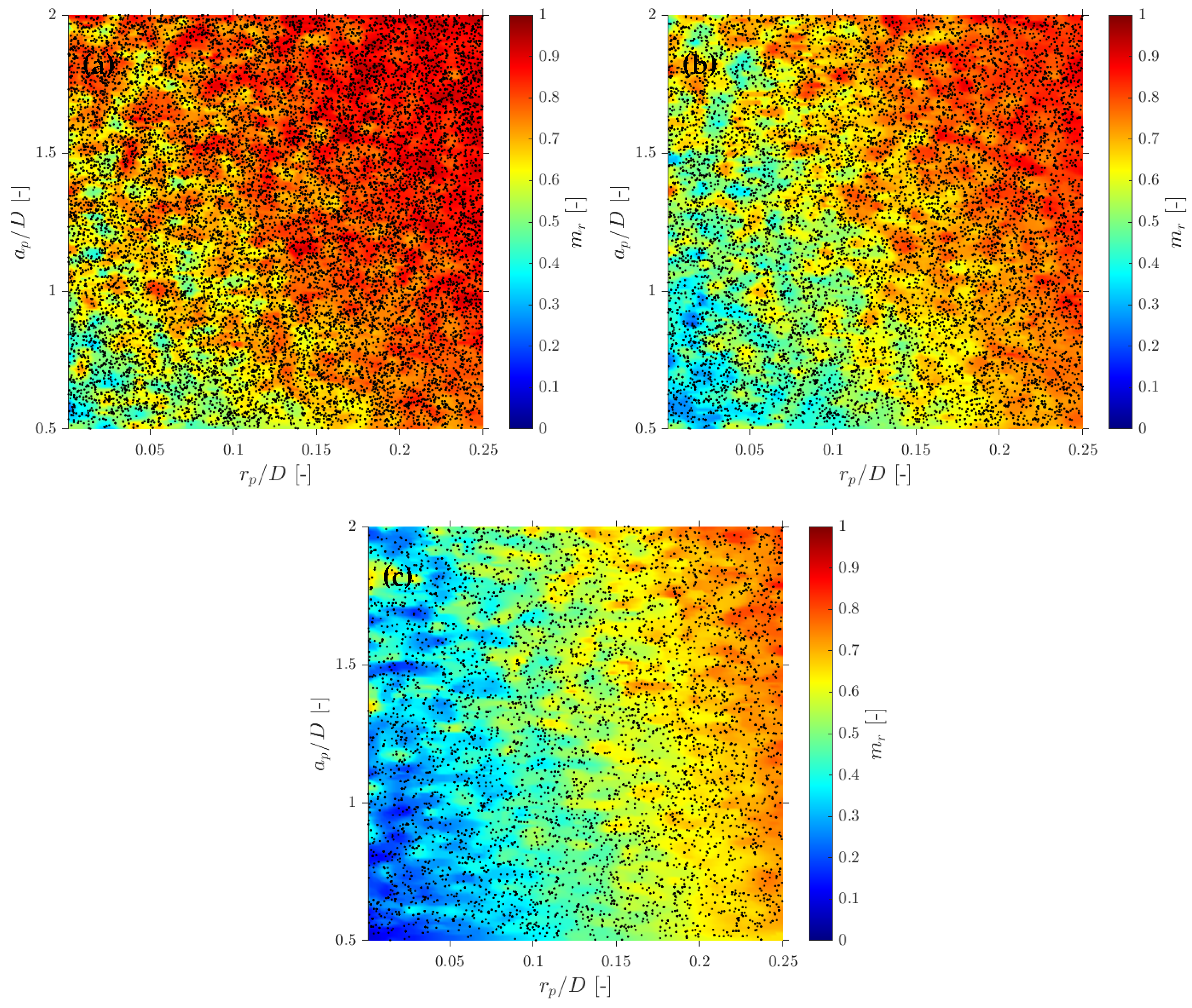 - Interfacial area concentration. The simulations confirm that a correction for the interfacial area concentration is required whenever the missing ratio is positive, in agreement with previous works. Here, this correction is shown to remain applicable without assuming spherical bubbles and when a full distribution of radial bubble velocities is considered. Using a volumetric definition of interfacial area ensures convergence in polydisperse conditions and provides a practical criterion for the minimum number of detected interfaces in experiments. An alternative correction expressed solely in terms of is proposed, extending the applicability up to . Within the recommended geometry range the corrected interfacial area remains quantitatively reliable, with typical errors below 10%; for a larger probe radius (e.g., ) the underestimation of can easily exceed 20– due to the increase in .