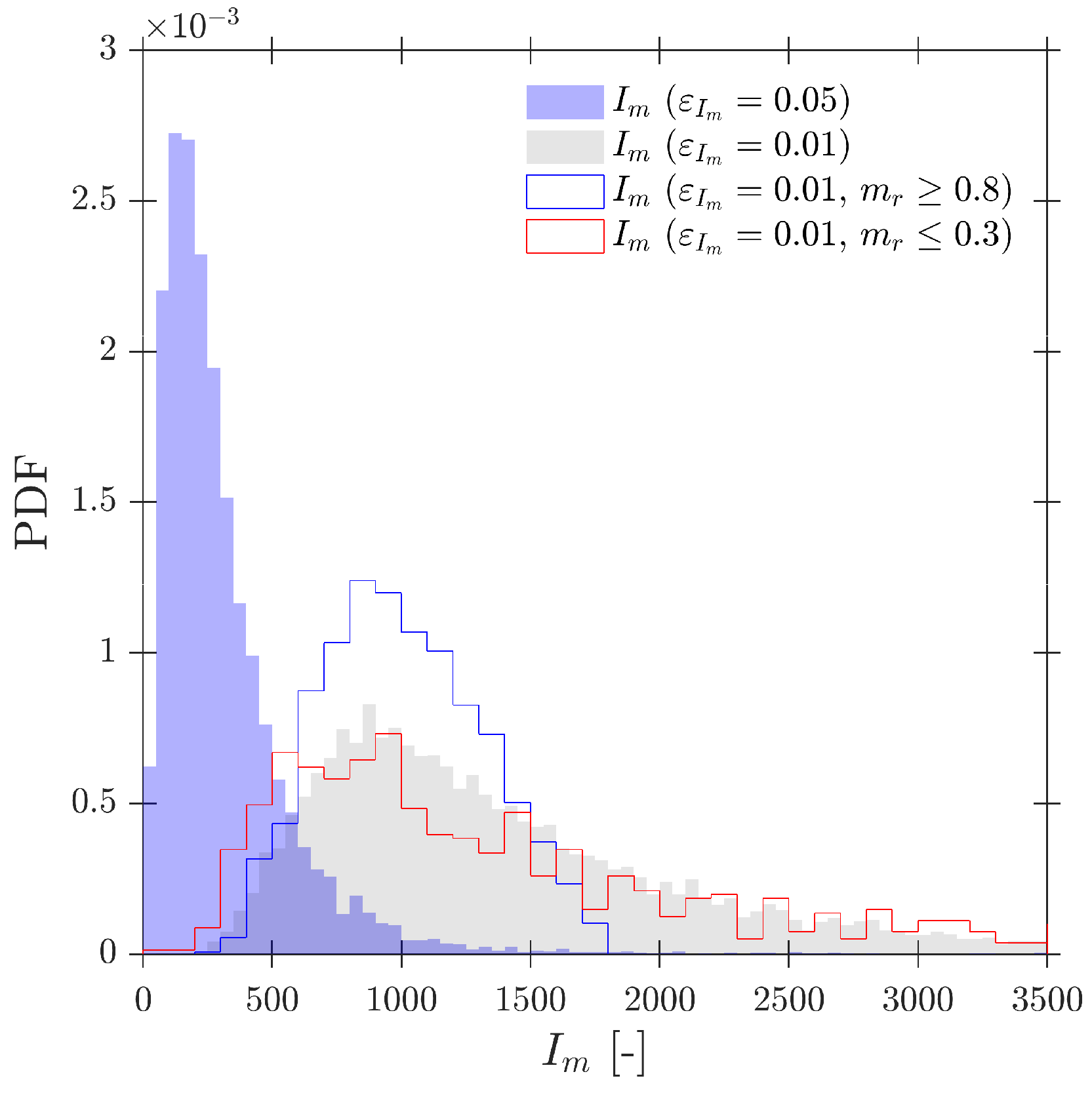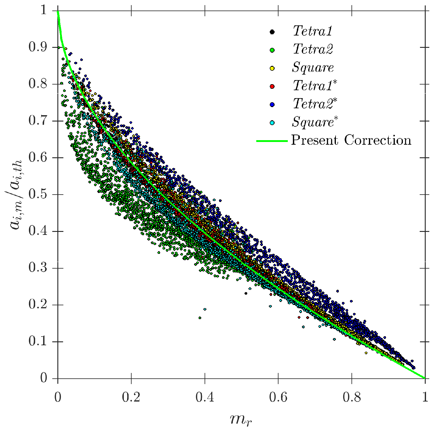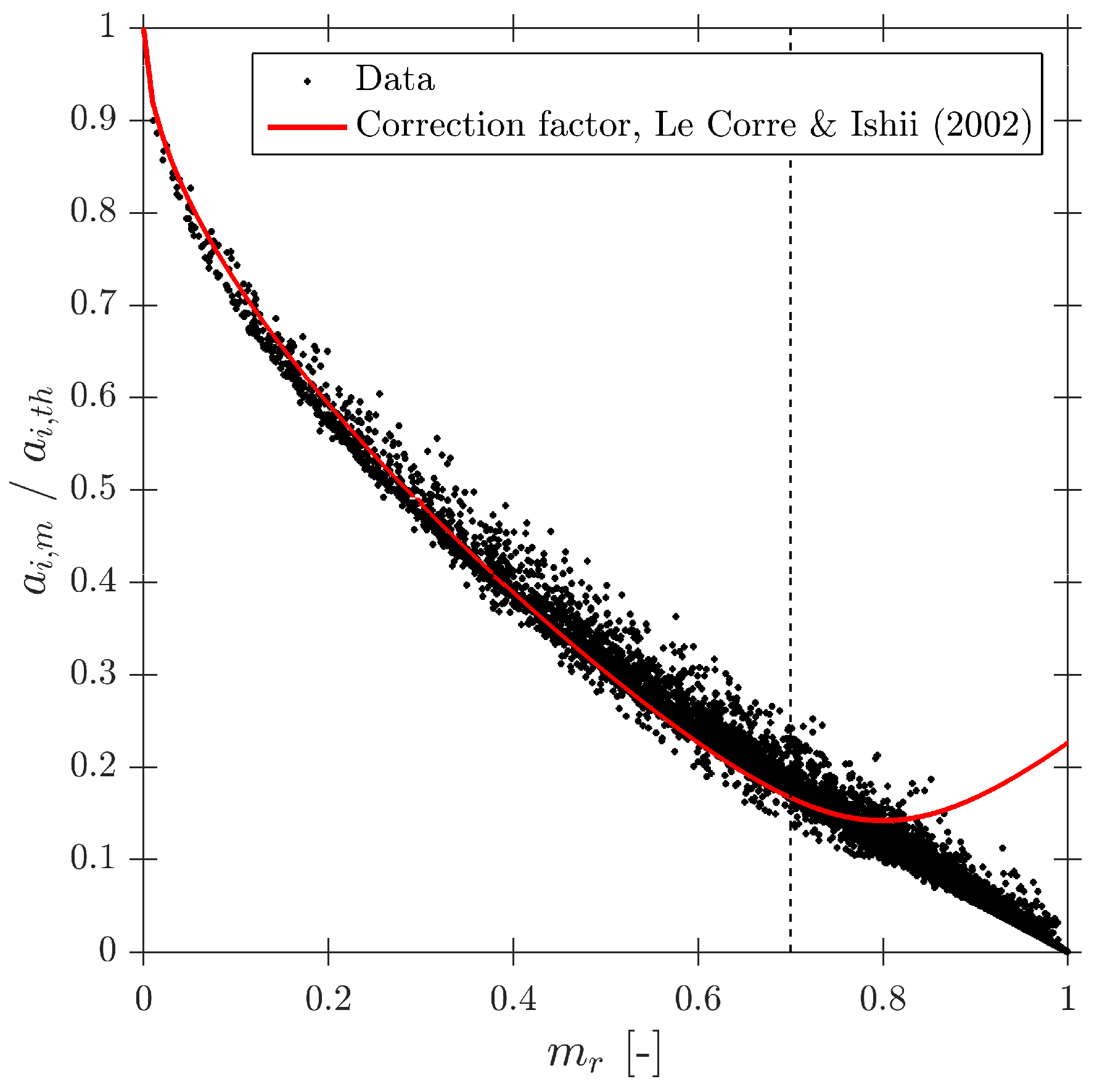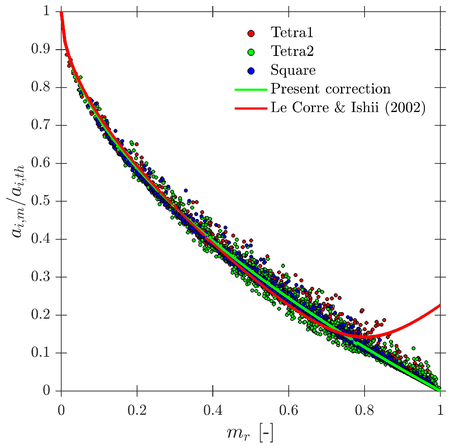- : is the corrected value for , as long as it is obtained from , but only for computed bubbles:Hence, the value gives the time-averaged local interfacial area measured by an ideal sensor probe (negligible , and thus, negligible error caused by local curvature) but considering the fact that bubbles are missed because of sensor probe dimensions and radial bubble velocity fluctuations. Therefore, provides the exact local value for interfacial area as , but without considering the missing bubble contribution.