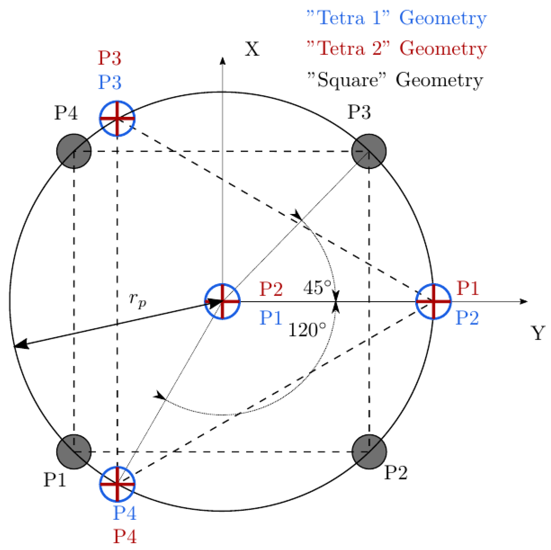 | , | Axial and radial spacing between rear tips and the front tip (m). |