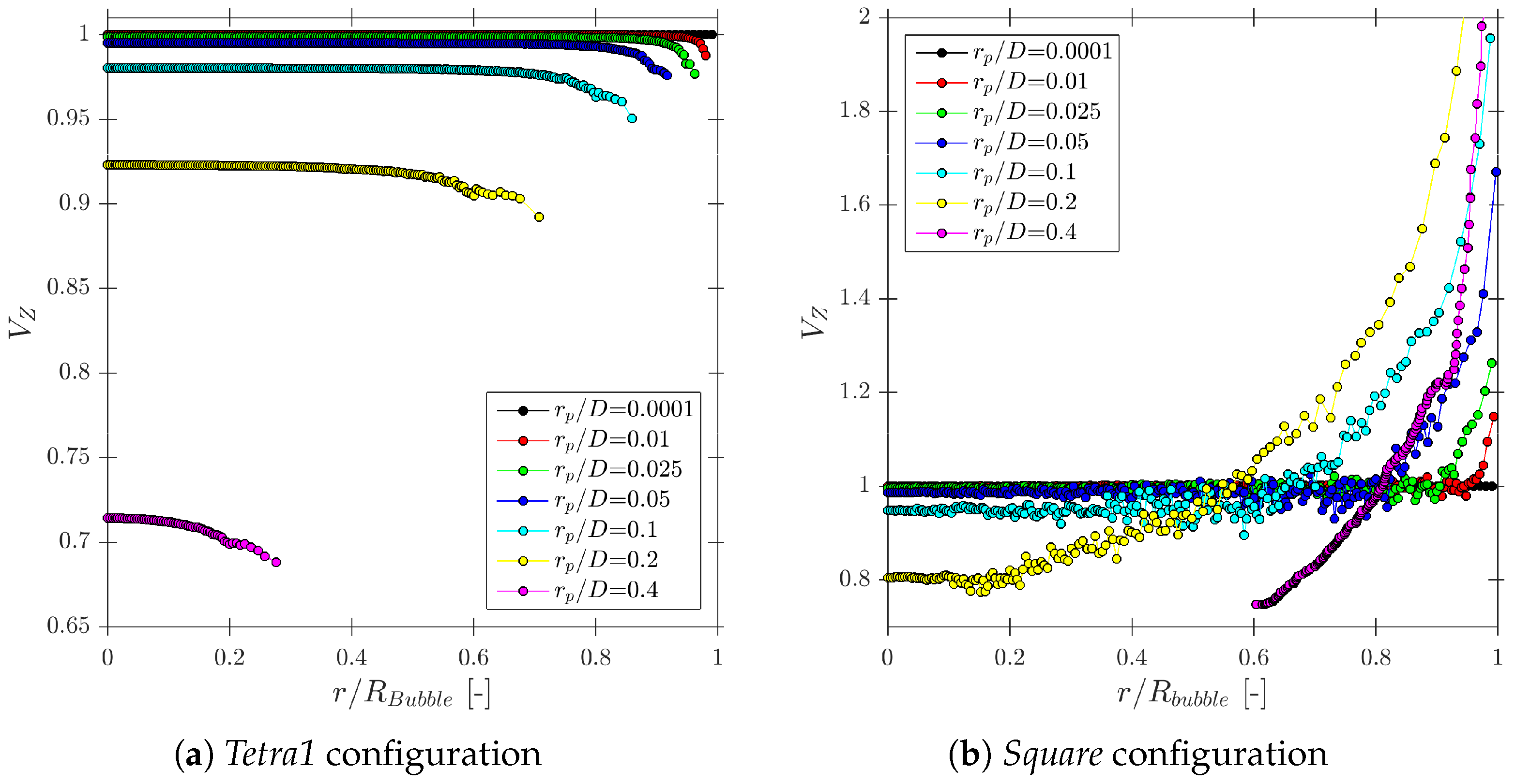 - Previous studies [6,13,14,16] were performed considering a spherical bubble geometry assumption. In this case, bubble–probe relative orientation is not important as long as all possible orientations can be achieved only by changing bubble velocity vector direction. However, if ellipsoidal bubble geometry definition is considered, bubble–probe orientation is very important to simulate more realistic and general scenarios. For example, the individual bubble–probe interaction depicted in Figure 11 can only be achieved by defining the probe location and orientation in a independent reference coordinate system.