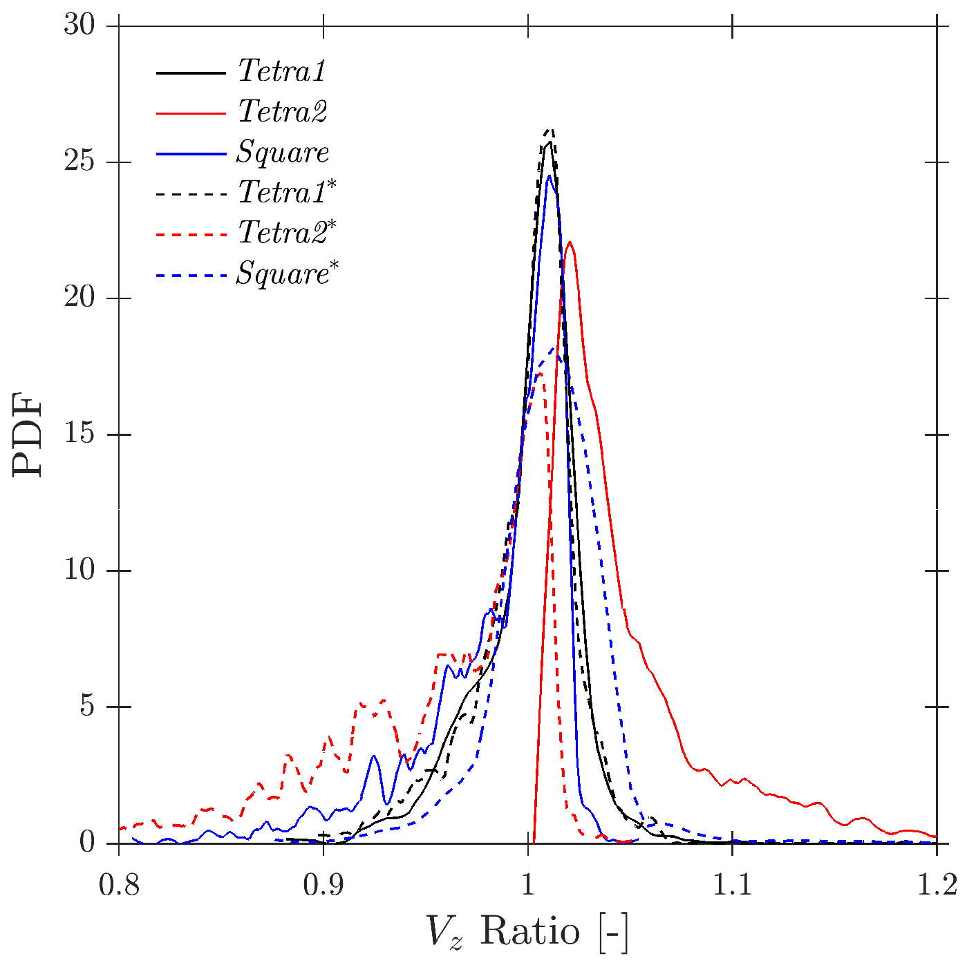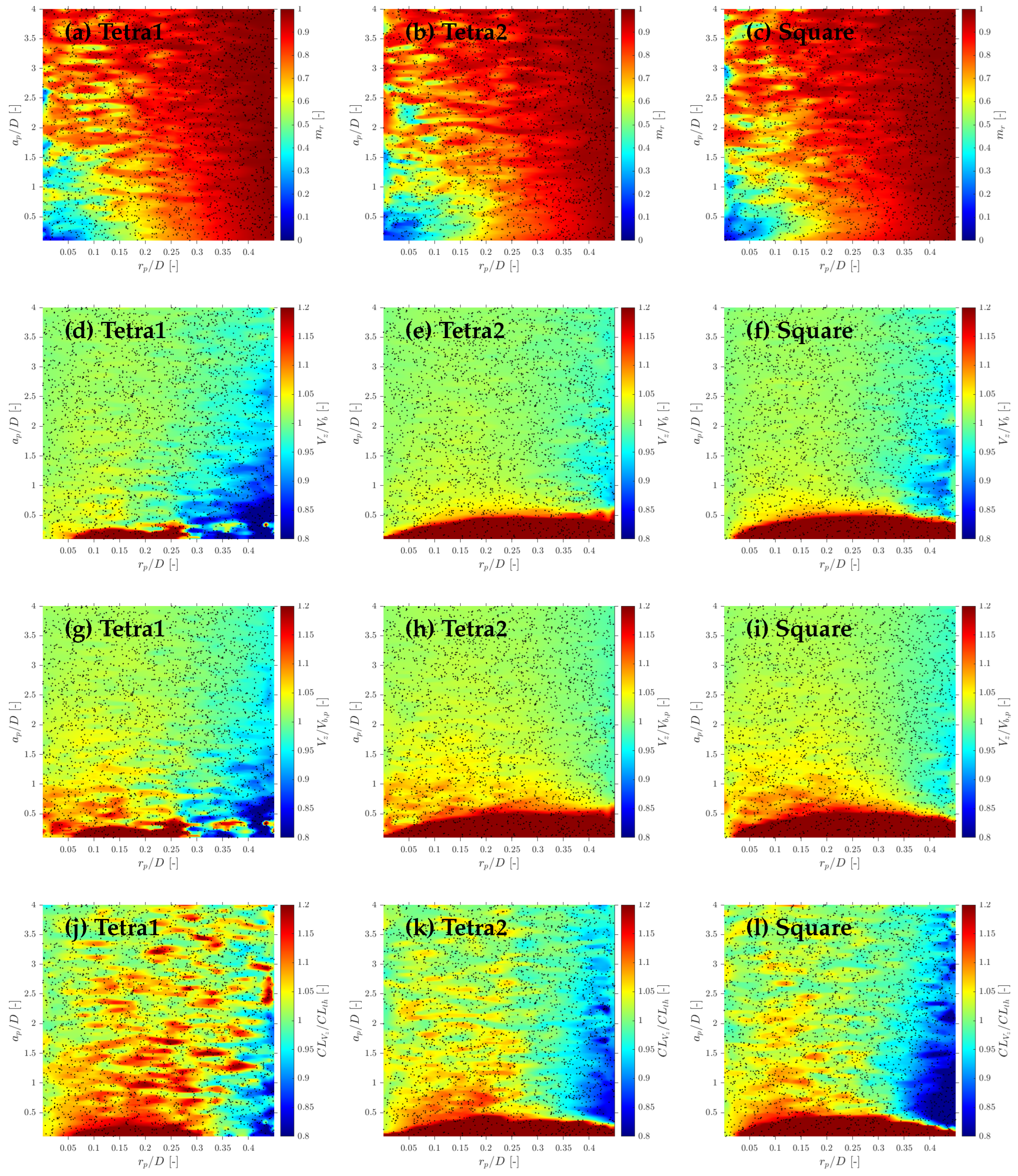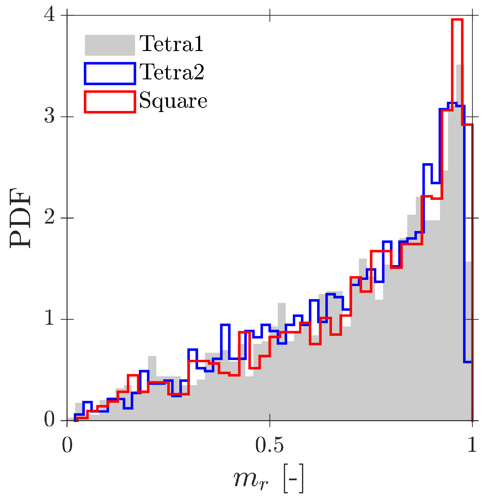 - Near-wall configurations. The probe arrangement with respect to the wall has a noticeable impact on the estimated local quantities. Configurations that place a rear tip too close to the wall increase the missing ratio and distort both velocity and chord length estimates. Among the tested layouts, the Tetra1 configuration is identified as the most suitable for near-wall measurements, as it mitigates these effects and yields more balanced sampling of bubble impacts.