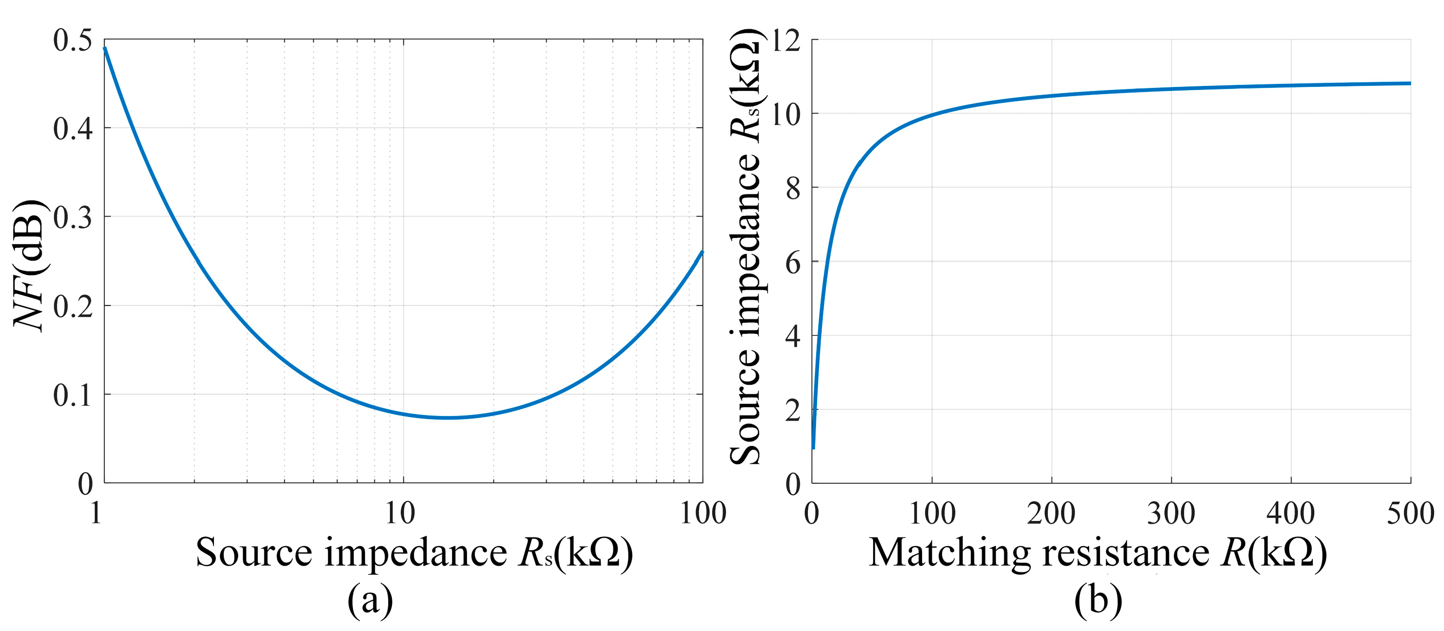 (a) The source impedance Rs vs. matching resistance R. (b) Noise figure NF vs. source impedance Rs.
