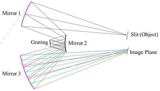 Generally, a hyperspectral camera can be divided into a collimating system and a focusing system, separated by a grating. Both collimation and focusing can be implemented using either lenses or mirrors. An all-reflective optical system is preferred as it significantly improves energy efficiency. By employing a carefully designed optical scheme with an all-spherical mirror configuration, system costs can be substantially reduced. To achieve the collimating and focusing functions, at least two mirrors are required for each subsystem. Two spherical mirrors with coincident curvature centers make up the most basic two-mirror optical system, which is commonly referred to as the Schwarzschild objective, which was first proposed by German physicist Karl Schwarzschild [35]. By symmetrically arranging two Schwarzschild structures sharing a common convex mirror with identical center and radius of curvature, a Schwarzschild imaging spectrometer consisting of only three reflective mirrors can be realized. Another advantage of this configuration is that it enables the use of a plane grating as the dispersive element, thereby further reducing cost. As shown in Figure 1, incident light entering through the slit is collimated by the upper section of concave mirror 1 and convex mirror 2 and then directed onto the plane grating. The dispersed reflected light is subsequently focused by the lower portion of convex mirror 2 and concave mirror 3, ultimately forming dispersed spectral stripes on the image plane.