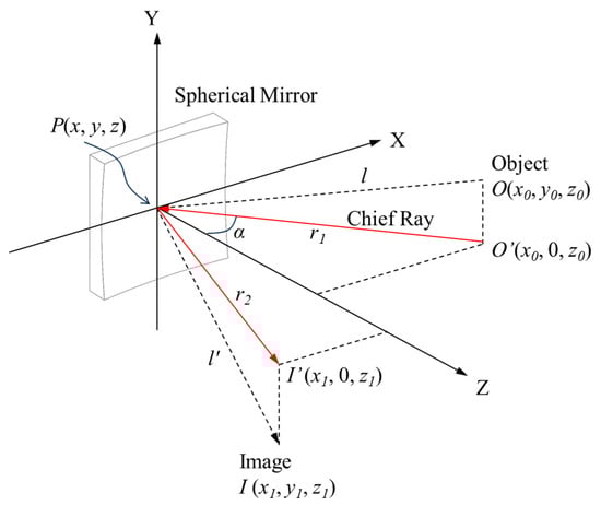 The designing of the Schwarzschild imaging spectrometer was started by analyzing the astigmatism-cancelation conditions for a two-mirror reflective system. According to the optical path length (OPL) theory, the OPL between the object and the image can be used to determine wavefront and ray aberrations in accordance with the image quality standards [26]. As shown in Figure 2, if a light ray coming from the object point O(x0, y0, z0) illuminated the point P(x, y, z) on the mirror, and was then reflected to the image point I(x1, y1, z1), the corresponding OPL is