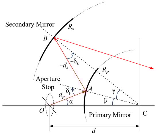As previously discussed, an inverse approach was used to analysis the astigmatism-free condition of two-mirror system. In this case, parallel light coming from the aperture stop first arrived at the primary mirror with a radius of curvature of Rp, then reflected to the secondary mirror (Rs), where the light was focused, as shown in Figure 3. According to the OPL theory, the distance (Δr) between the tangential and sagittal image locations of the two-mirror system can be expressed as [26]: