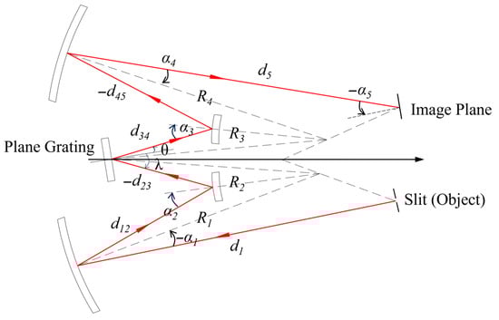 After selecting the optical components, another MATLAB program was developed to compute and optimize the initial configuration, mainly according to Equations (9) and (10). Referring to the parameters illustrated in Figure 4, since R2 and R3 are combined into a single mirror, parameters such as the mirror curvature radii, d1, d12, d45, d5, and α1–α4 are determined based on the astigmatism-cancelation condition (Equation (9)). However, d23 and d34 remain undetermined at this stage, as both the incident and diffracted beams at the plane grating were assumed to be collimated, making these distances theoretically independent of propagation. Nevertheless, d23 and d34 do influence the final F-number and image quality: a shorter d23 helps improve image performance but brings the grating closer to the convex mirror, which requires a larger F-number to avoid optical path obstruction. Therefore, an additional MATLAB program was written to optimize d23 (with d34 derived accordingly). Ultimately, all geometric parameters of the optical system were computed and optimized, as summarized in Table 3.