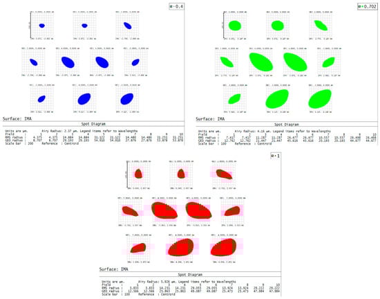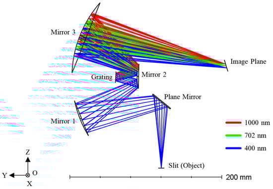 Based on the data summarized in Table 3, a hyperspectral imaging camera operating in the 400–1000 nm wavelength range was designed. Figure 5 shows the ray tracing simulation of the system in Zemax OpticStudio (2023 R1.00, 64-bit). The optical path proceeds as follows: incident light first enters the system through the slit (Object), is redirected by a flat folding mirror, and then arrives at the off-axis concave mirror (Mirror 1). Mirror 1 and Mirror 2 collimates the beam and directs it toward the plane grating, which served as the spectral dispersive element. The dispersed beams of different wavelengths are then converged by the concave mirror (Mirror 2) and ultimately form distinct spectral lines on the image plane. The diagram clearly illustrates the ray paths for three characteristic wavelengths: 400 nm (blue), 702 nm (green), and 1000 nm (red).