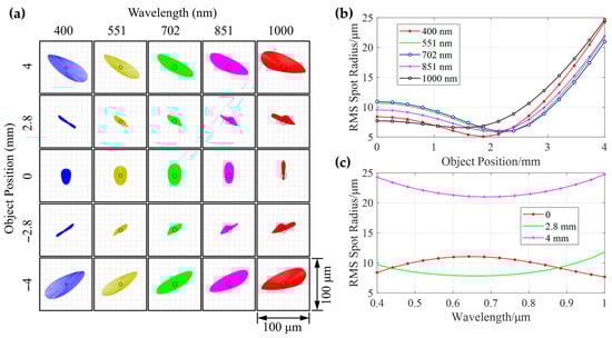 Comprehensive evaluation of optical system performance through spot diagram analysis and RMS spot radius quantification. (a) Two-dimensional grid of spot diagrams displaying the distribution and morphology of light spots across wavelengths (400–1000 nm) and object positions (−4 to +4 mm). Note that 702 nm was selected as chief ray since its spot were located at the center. The circles in the middle indicate the Airy disk. (b) RMS spot radius as a function of object position (0–4 mm) for five distinct wavelengths. The curves demonstrate the system’s field dependence, with minimal radius variation (<25 μm) indicating effective correction of field curvature and off-axis aberrations. (c) RMS spot radius versus wavelength (400–1000 nm) at three object positions (0, 2.8, and 4 mm). The plots reveal spectral uniformity, as all curves maintain low RMS values (<25 μm) across the band.