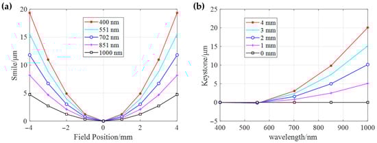 Smile and keystone analyses are critically important in the design and performance evaluation of HSI systems, as they directly quantify two key forms of spectral and spatial distortion that degrade data quality. Figure 7a,b presents the quantitative simulation analysis results of the Smile and Keystone of the designed hyperspectral imaging system, respectively. The results indicate that the Smile value is zero at the center of the field of view (0 mm) and increases symmetrically toward the edges (±4 mm), with a maximum absolute value of approximately 20 μm, which is less than the length of four pixels. It is noteworthy that the bending is significantly more pronounced in shorter wavelength bands (e.g., 400 nm) compared to longer wavelength bands (e.g., 1000 nm), indicating a stronger field dependence of chromatic aberration in the short-wave region. Nevertheless, the overall magnitude demonstrates effective control of this aberration. The Keystone value is nearly zero at the short-wave starting end (around 400 nm) and increases monotonically with wavelength, reaching a maximum value of about 20 μm at 1000 nm. Additionally, this distortion exhibits clear field dependence, with larger Keystone values observed at greater field positions (e.g., 4 mm). Results confirms that both Smile and Keystone distortions are effectively constrained within the size of 4 pixels (lower than 20 μm) across the entire waveband and full field of view. This implies that spectral curvature and image point displacement have minimal impact on the spectral purity and spatial registration accuracy of the final hyperspectral data cube.