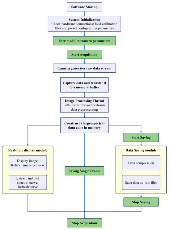 Workflow diagram of the hyperspectral data acquisition software, showing the multi-threaded operational pipeline of the custom software developed for push-broom hyperspectral imaging. The workflow integrates parameter adjustment, real-time feedback, and asynchronous data saving, supporting efficient and flexible control throughout the imaging mission.