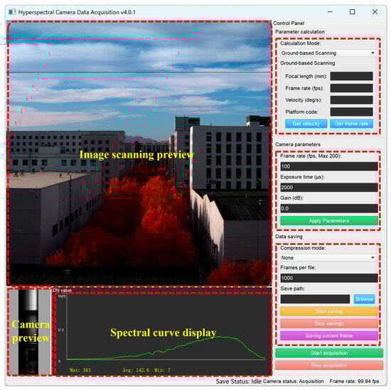 The user interface of the software is shown in Figure 10. Since the hyperspectral camera operates in push-broom scanning mode, real-time preview is not intuitively straightforward. To address this, a scanning preview function was integrated into the software interface, allowing users to observe dynamically updated scene imagery during the scanning process. This enables real-time assessment of data quality and rapid adjustment of camera parameters. Additionally, a calculator tool was incorporated in the upper-right corner of the interface, supporting two operational modes: ground-based sweep scanning and aerial push-broom scanning. This feature assists users in performing on-site calculations of critical parameters such as scanning speed and frame rate.