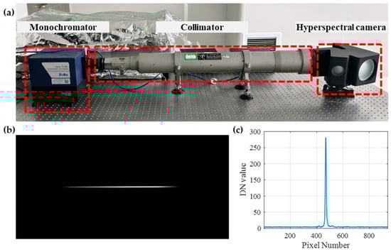 Following the hardware integration process, wavelength coverage and spectral resolution were experimentally analyzed in the dark room. The calibration system consists of three main components: a monochromator (Omni-λ300i, Zolix Co., Ltd., Beijing, China), a collimator (F550, Changfu Technology Co., Ltd., Beijing, China), and the hyperspectral camera under test, all mounted on an optical bench to ensure mechanical and optical stability, as shown in Figure 12a.