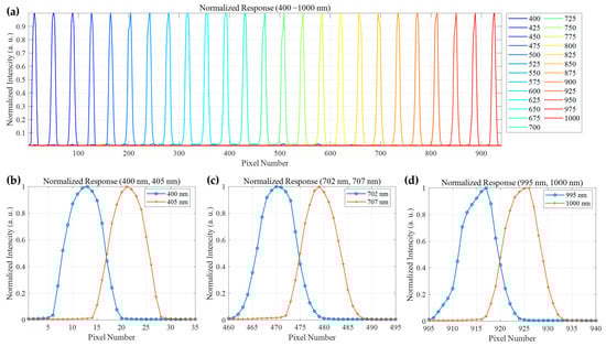Spectral response characterization of the hyperspectral camera. (a) Normalized spectral response curves acquired at 25 nm intervals across the 400–1000 nm range. (b) Response curves for 400 nm and 405 nm illumination, showing clear separation between adjacent wavelengths, confirming a spectral resolution better than 5 nm in the short-wave region. (c) Corresponding curves for 702 nm and 707 nm, illustrating consistent wavelength discrimination capability in the visible-red region. (d) Curves for 995 nm and 1000 nm, validating performance in the near-infrared with maintained resolution.