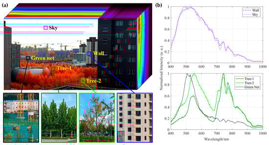 This experiment also successfully acquired and analyzed the three-dimensional data cube generated by the push-broom hyperspectral imaging system. The rich spectral information contained within provides critical evidence for accurately distinguishing and identifying different ground objects. As shown in Figure 15a, the data cube clearly displays typical urban features, including building facades, the sky, two types of trees, and green dust nets at a distant construction site.