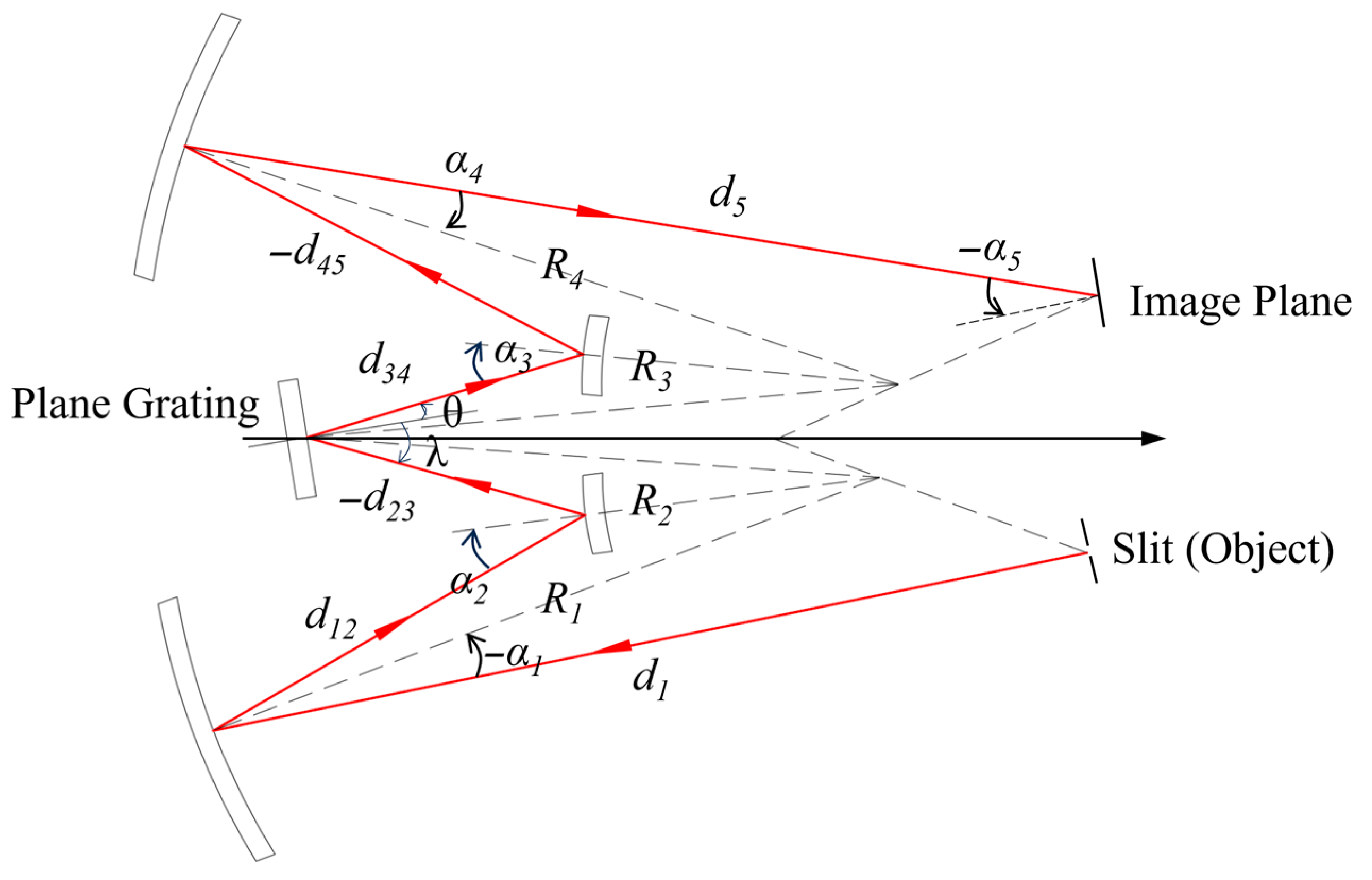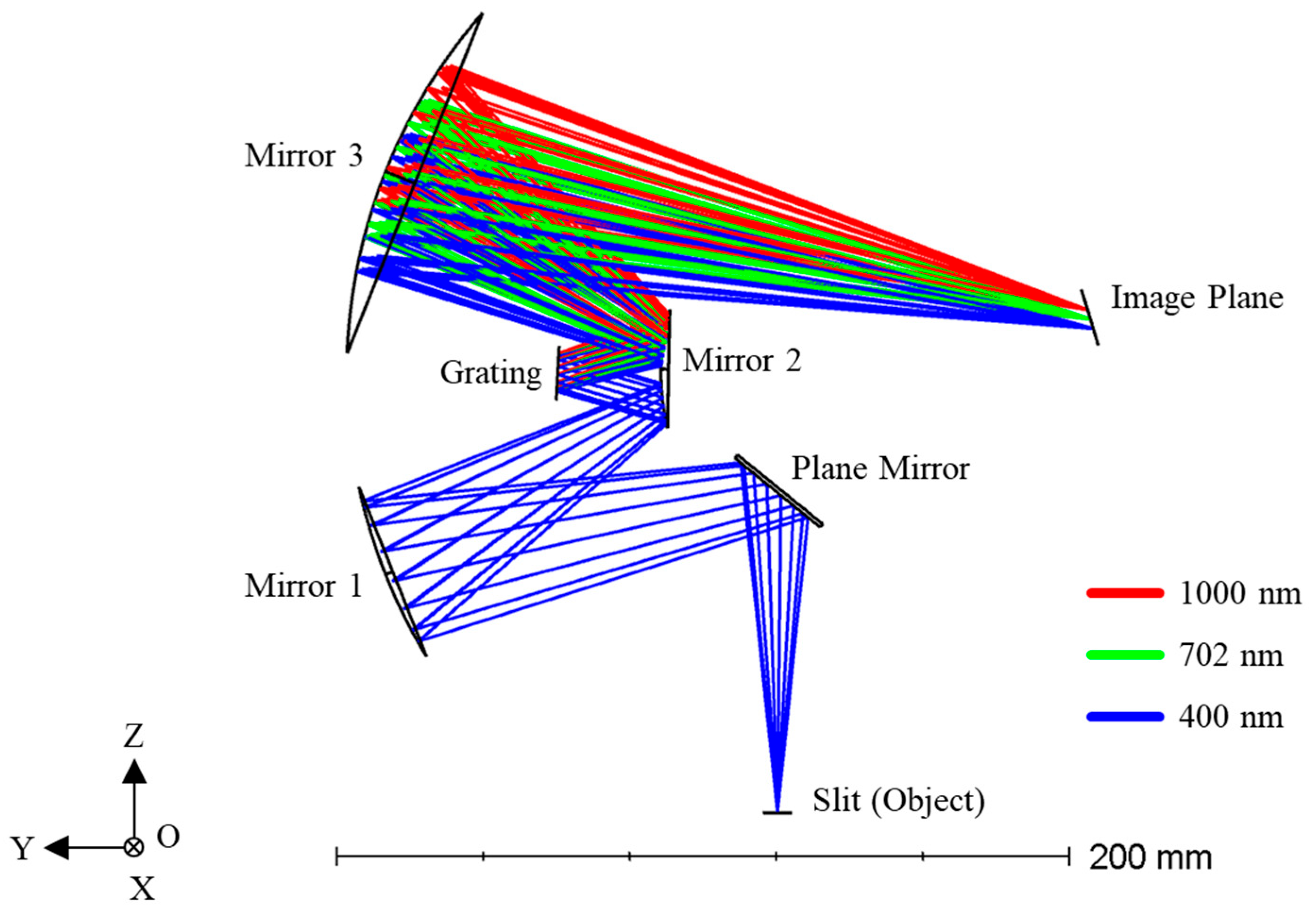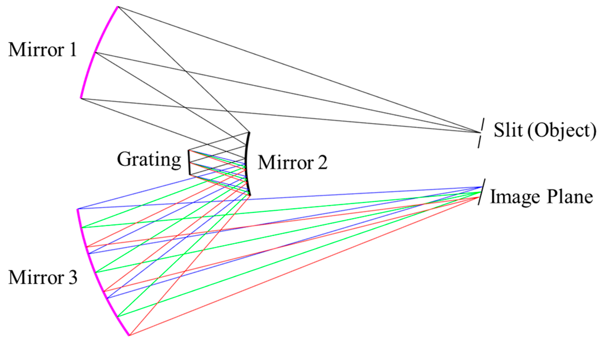 Section 3.3. Key components, including the off-axis concave mirror (Mirror 1), convex mirror (Mirror 2), re-imaging concave mirror (Mirror 3), folding mirror, as well as the slit and image plane, were all precisely mounted onto standard threaded mounting holes on the optical platform using high-precision six-axis adjustment mounts (providing pitch, yaw, roll, and XYZ translation), as shown in