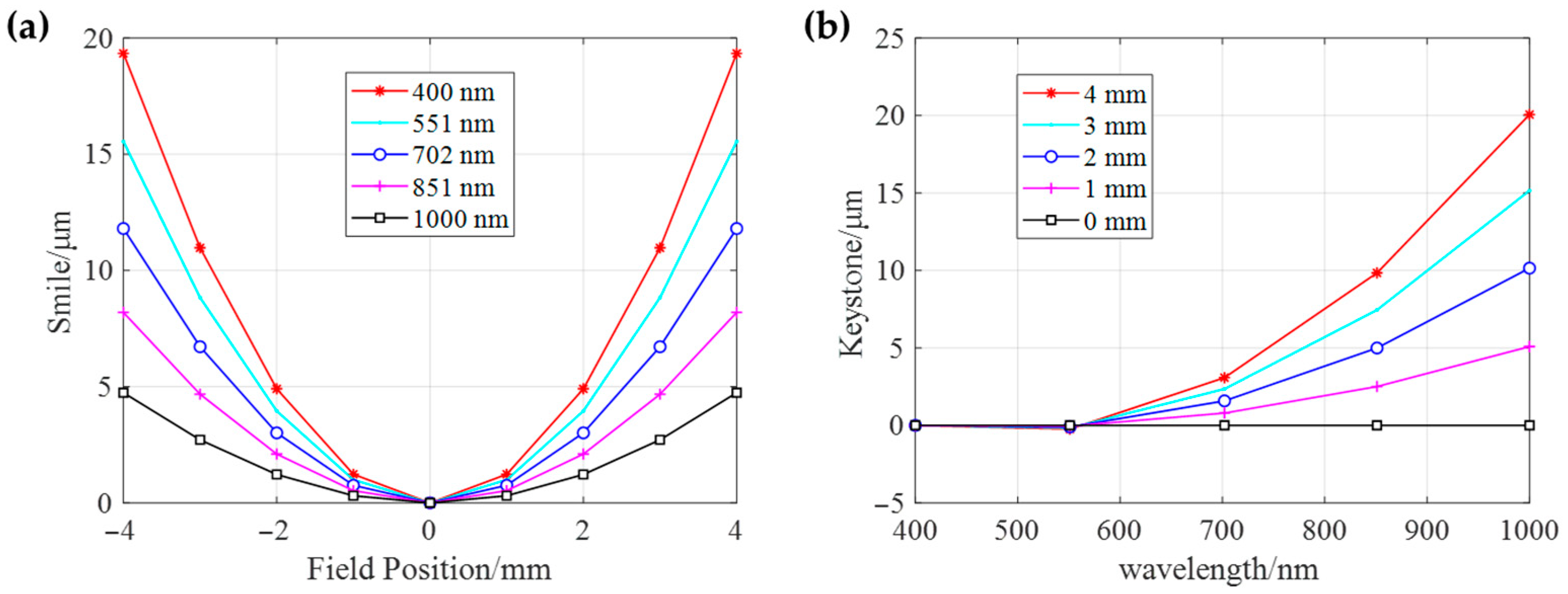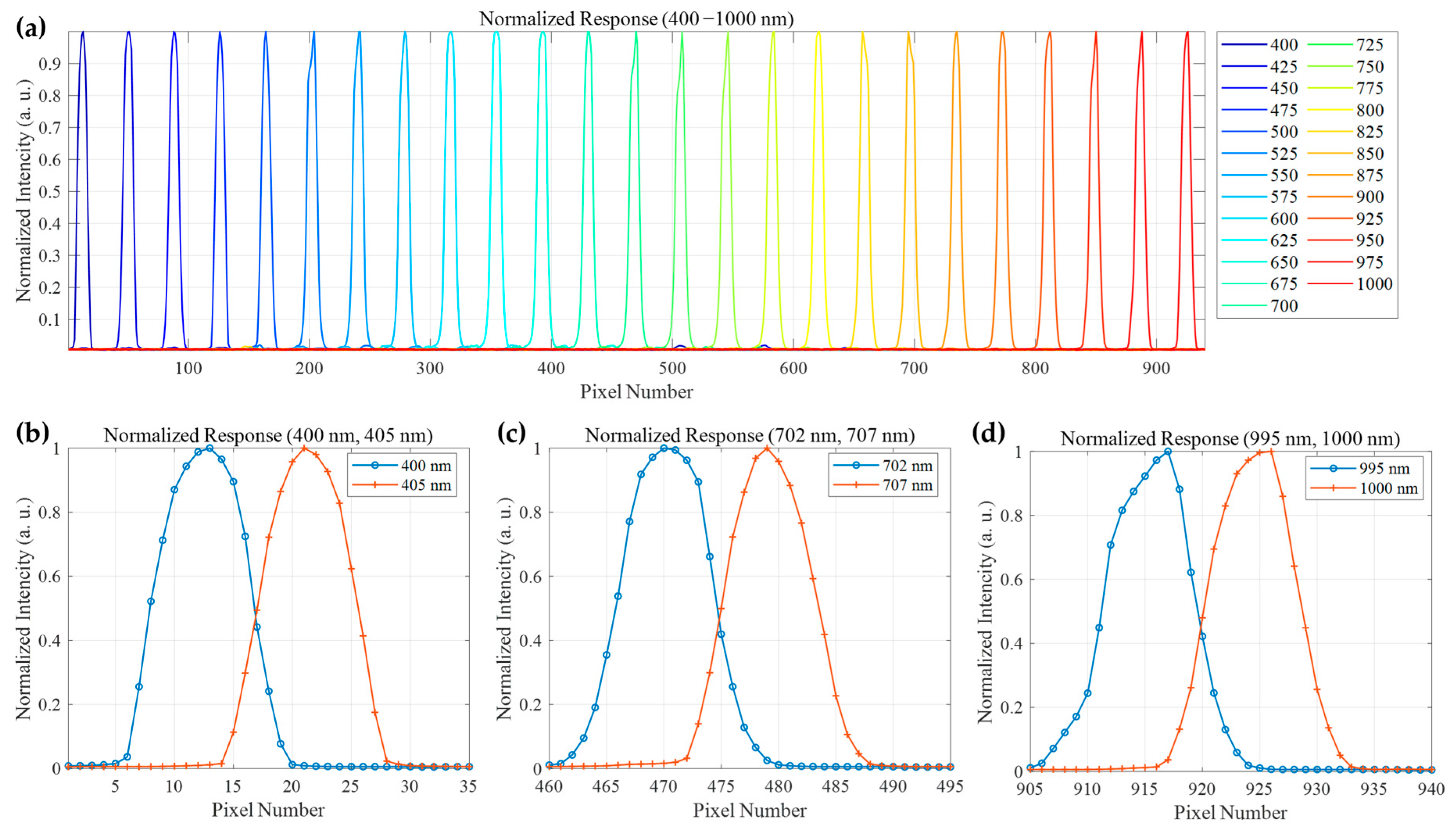 Figure 13b–d display the normalized response curves for three wavelength pairs: 400 nm and 405 nm, 702 nm and 707 nm, and 995 nm and 1000 nm, respectively. The results indicate that across different bands, i.e., short-wave (400/405 nm), mid-wave (702/707 nm), and long-wave (995/1000 nm), the response curves for all wavelength pairs are effectively separated, forming two distinct and resolvable peaks. This result demonstrates that the camera can clearly distinguish adjacent monochromatic lights with a wavelength difference of only 5 nm. According to the Rayleigh criterion, two adjacent wavelengths are considered resolved if their peak responses are clearly distinguishable and the valley between them is lower than 80% of the peak intensities. The curves for all wavelength pairs shown in the figure exceed this criterion. In conclusion, these test results proved that the developed hyperspectral camera prototype achieves a spectral coverage of 400–1000 nm with a resolution better than 5 nm across the entire operating band.