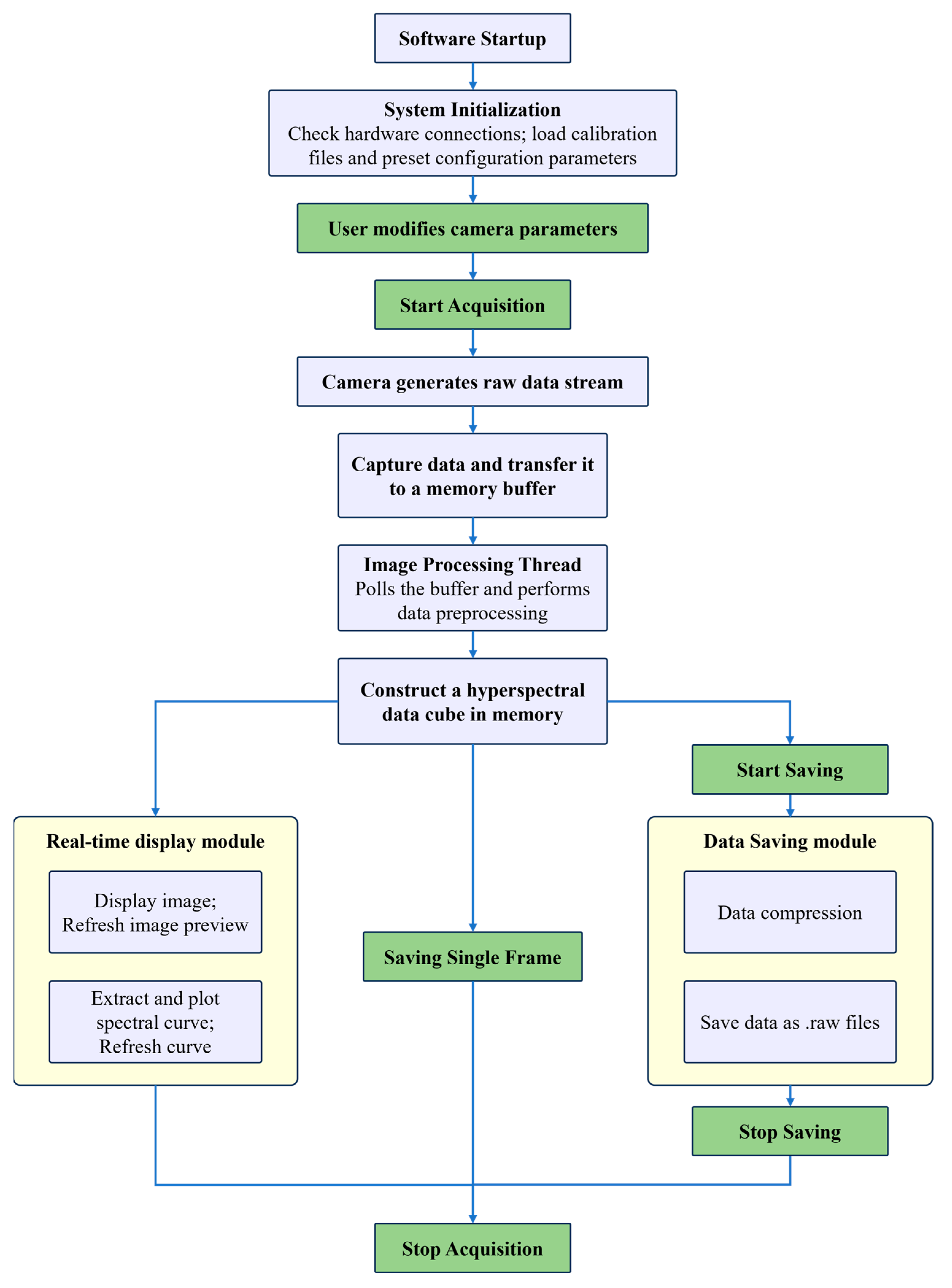 Compared to previous works, this paper achieves a notable spectral coverage of 400–1000 nm VNIR range, surpassing the range of previous systems which typically covering approximately 400–800 nm. The spectral resolution of 5 nm, while slightly lower than some counterparts, results from a deliberate design choice utilizing spherical off-axis mirrors, which present challenges in high-precision alignment but offer significant advantages in cost and manufacturability. A key feature is the high number of spectral bands (930), which enhances spectral sampling density. The potential signal reduction per band inherent to such a high channel count is effectively mitigated by the high throughput of the all-reflective optical system. Furthermore, practical data volume can be optimized via pixel binning, tailoring the output to application needs without compromising utility. Critically, a performance metric not captured in the table is the integration time, directly governing frame rate. For instance, under comparable good illumination conditions (e.g., 10:30 a.m.), the system in Ref. [