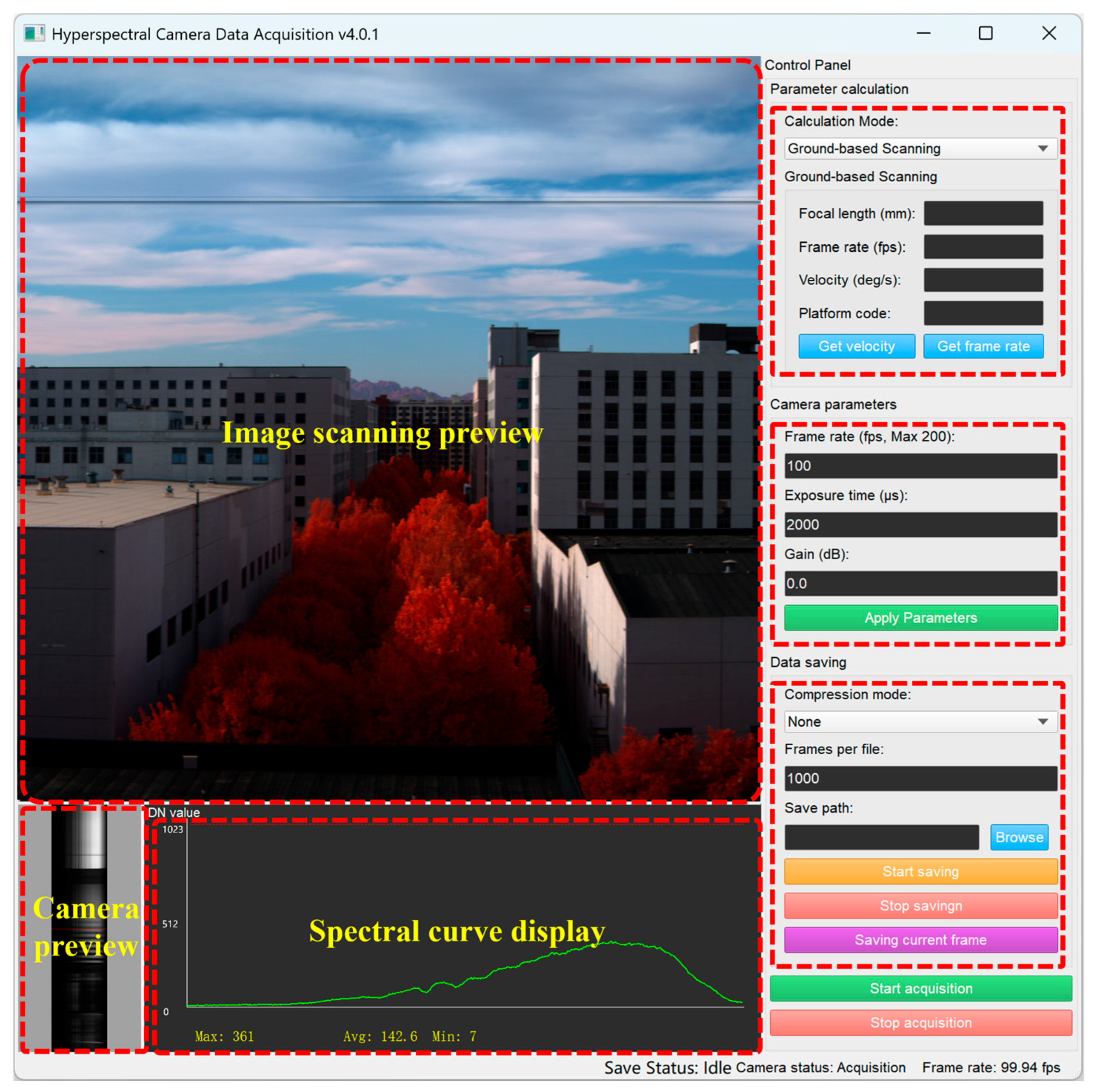 Following the completion of hardware integration and software development for the hyperspectral imaging system, an imaging experiment was conducted to evaluate the camera’s functionality and performance. The experiment was conducted on the 6th floor of Tower D in No. 9 Dengzhuang South Road, Haidian District, Beijing, at 10:00 a.m. under stable illumination conditions. The camera, equipped with a 25 mm focal length lens, was set to an exposure time of 5 ms and operated at a frame rate of 150 fps. It was mounted on a precision rotational stage to perform push-broom scanning of a natural scene containing various features such as trees, buildings, and the sky, while simultaneously saving data in real time.