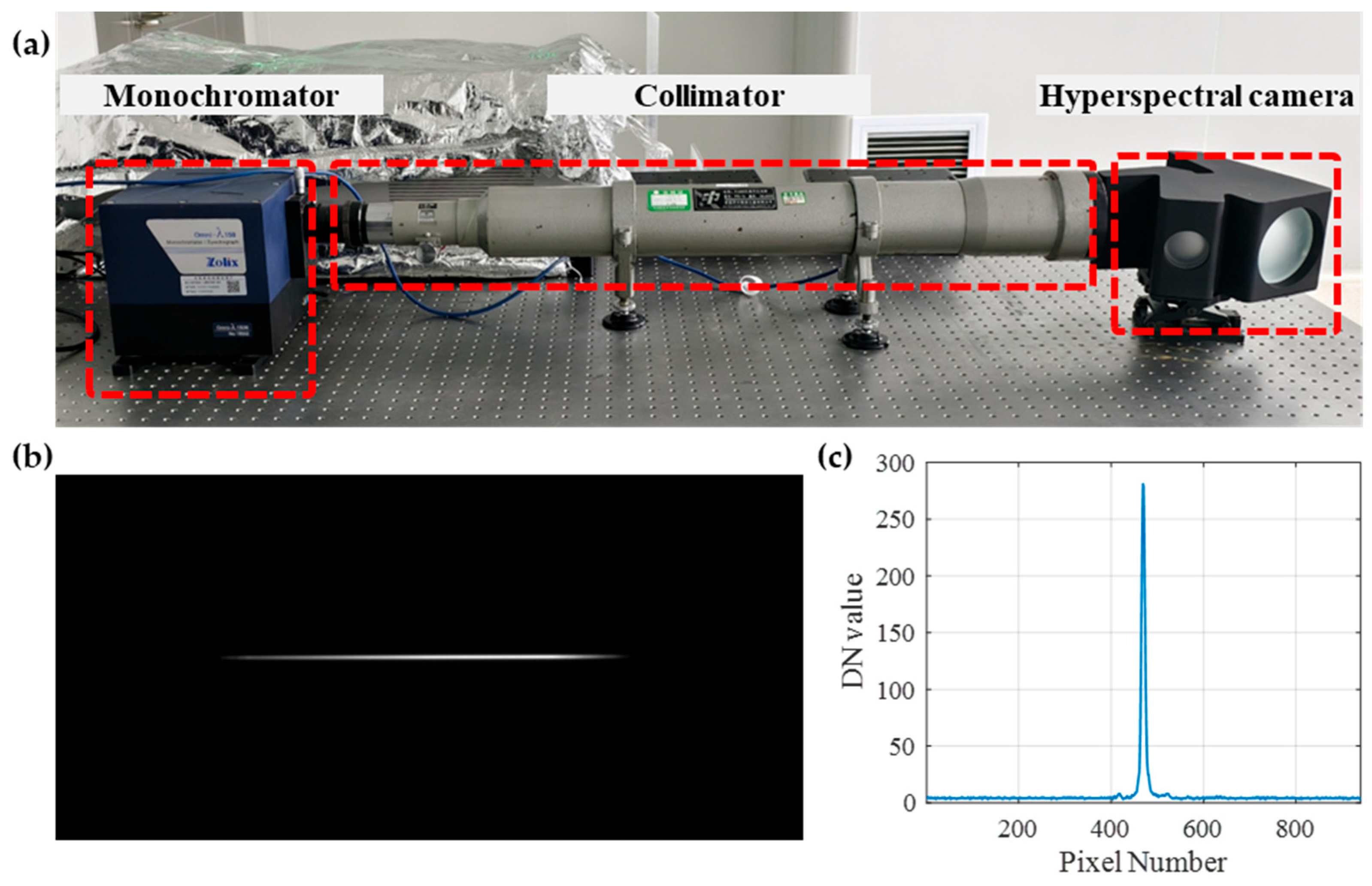 Wavelength calibration is a critical procedure in hyperspectral imaging. Its significance lies in establishing an accurate correspondence between each pixel of the camera’s detector and a specific wavelength, which directly determines the accuracy and reliability of the acquired spectral data. In the above setup, the monochromator generates quasi-monochromatic light with narrow spectral bandwidth and continuously tunable wavelength. The output beam is collimated to form a parallel light field, simulating an object at infinity and illuminating the entrance pupil of the camera under test. The hyperspectral camera receives this monochromatic light and forms an image of the slit on its image plane.