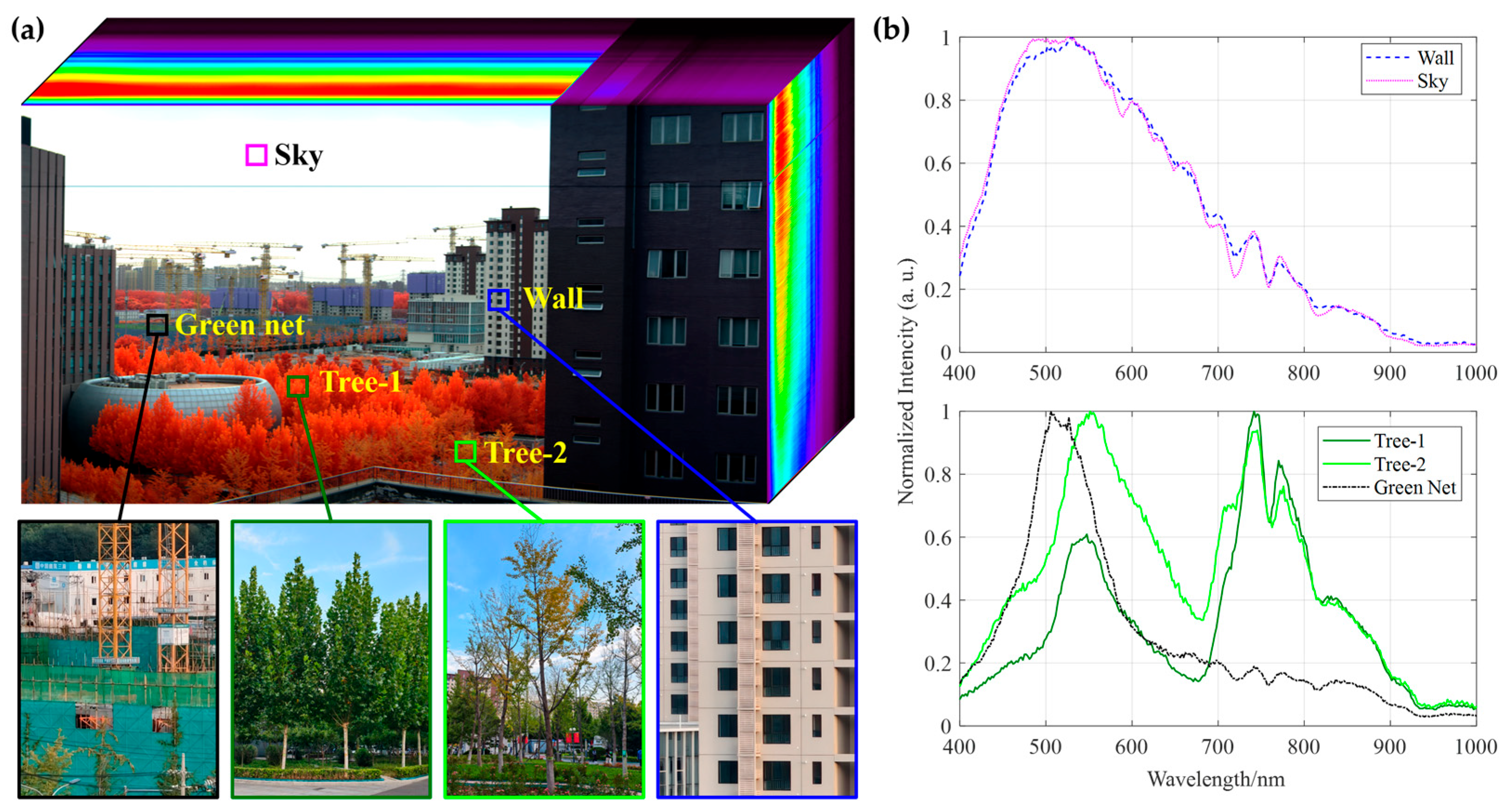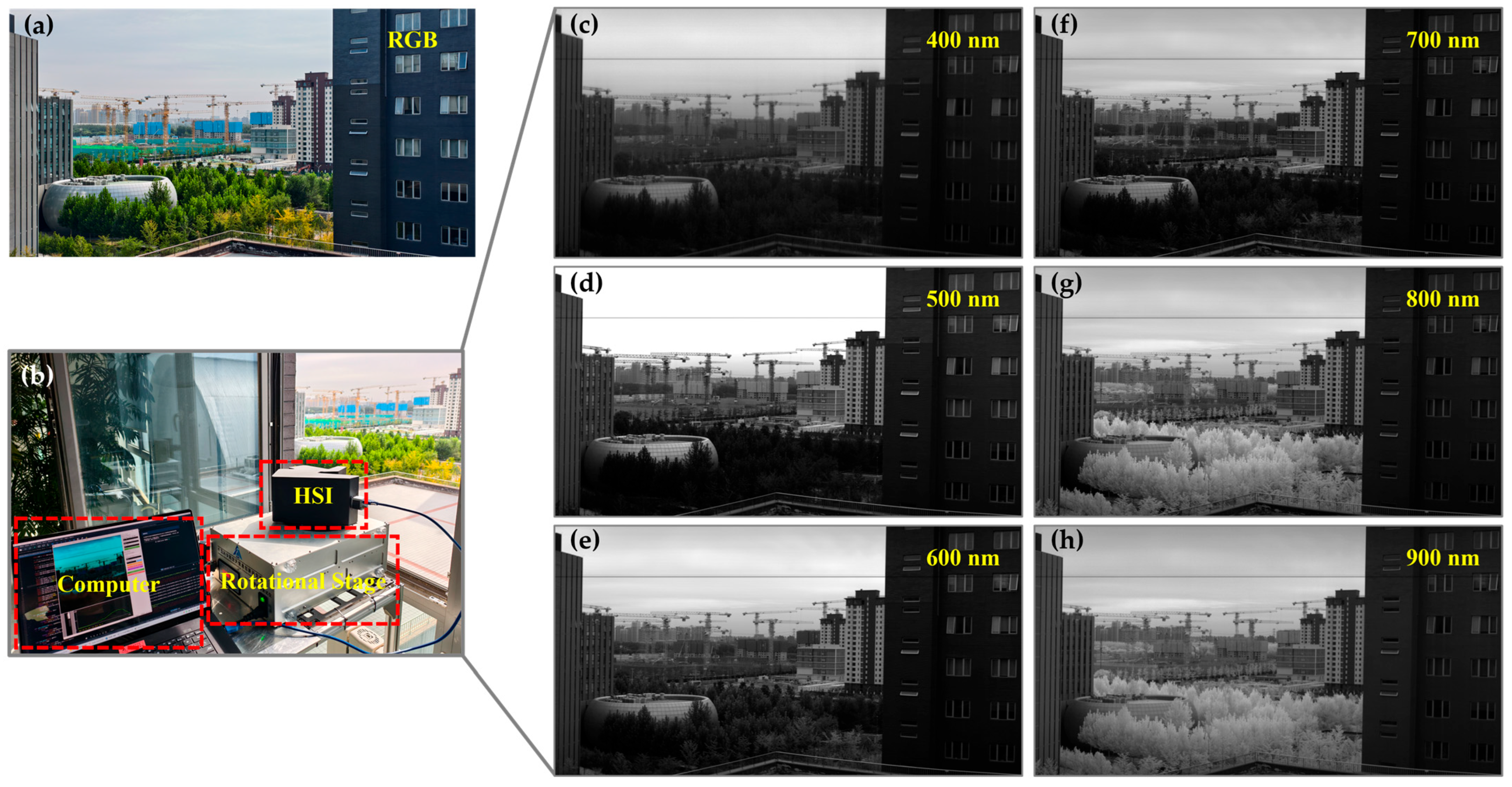 Figure 14a shows an RGB image recorded by a Nikon P950 camera (Nikon, Tokyo, Japan) with hyperspectral camera scanning, providing an intuitive visualization of the test scene: green trees, gray-white building facades, and a bright blue sky. The experimental setup, including the hyperspectral camera, the rotational stage, and the control computer, is shown in