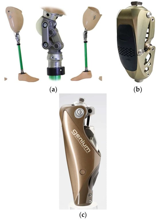 Types of knee prostheses: (a) single-axis mechanical hinge with manual lock; (b) semi-active module: passive hinge with an adjustable hydro-pneumatic damper; (c) intelligent knee with an integrated actuator, multi-axis IMU, and microprocessor control.