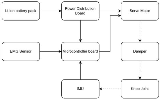 Considering the engineering and ergonomic factors outlined above, the target specifications of the prototype, as previously stated, are flexion range 0–120°, response latency ≤ 100 ms, mass ≤ 1 kg, cost price ≤ USD 500, autonomous operation ≥ 6 h, and sensor sampling rate ≥ 100 Hz. System modularity—a detachable sensor block, a swappable actuator module, and open CAD/PCB files [23]—supports adaptation to diverse anthropometric dimensions and facilitates local maintenance. Thus, the concept integrates current research trends (hybrid damping, EMG triggering, open design) with the practical objective of lowering the cost barrier for patients.