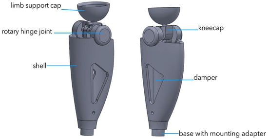 The design follows a modular principle: the Ti/Al load bearing “skeleton” is assembled on threaded inserts, the shell mounts as a replaceable “clip-case,” and the sensor block and actuator module are attached via DIN 790 screw interfaces. This solution simplifies personalized fitting, speeds up service operations, and enables replication of the prosthesis under constrained manufacturing resources—consistent with the original objective of delivering an affordable (<USD 500) and lightweight (<1 kg) semi-active device.