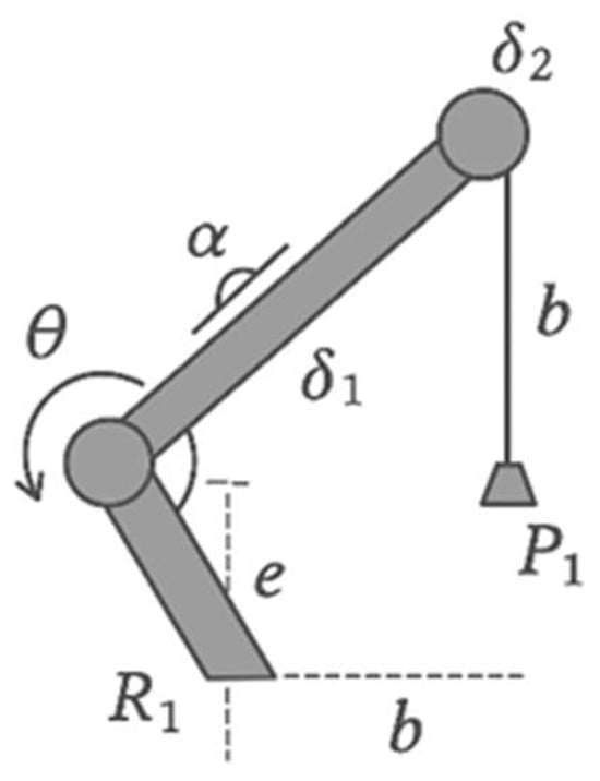 For a prospective hybrid architecture, we considered an AVT (Active Variable Transmission) kinematic scheme based on an offset crank–slider mechanism (chain R1P1R2R3) with an adjustable crank length δ2. The knee joint angle is denoted by θ (at joint R1), the stroke of the prismatic link P1 by δ1, the angular offset by α, the linear offset by e, and the connecting-rod length by b. From the link-length constraint,