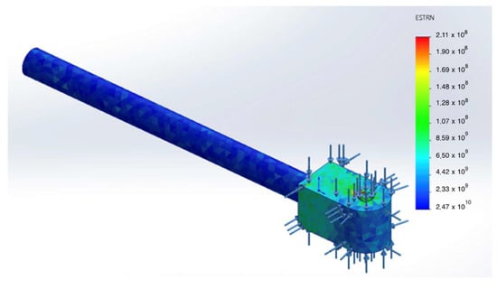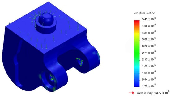 The static analysis showed that peak von Mises equivalent stresses () were localized at geometric transitions and other stress-concentration regions (see Figure 7 and Figure 8). The maximum stress in the hinge transition inserts reached , and at the base of the pyramid adapter. In all cases, the computed safety factor with respect to yielding , indicating adequate structural reliability.