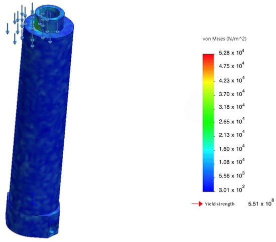 To assess structural reliability and optimize the elements of the intelligent transfemoral prosthesis, a finite element analysis (FEA) was performed. The calculations examined the stress–strain state (SSS), yield safety margin, and fatigue durability of the structure under conditions simulating the mid-stance phase of gait. The design loads were selected based on the anthropometric and kinetic data of a 100 kg patient, taking into account a dynamic factor for “landing” from a height of 0.2 m, corresponding to a load of 2.94 kN.