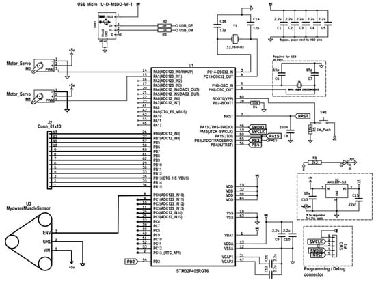 Given these premises, we propose a system in which a surface EMG sensor placed over the rectus femoris (m. rectus femoris) and an inertial unit (accelerometer + gyroscope) provide dual-channel feedback. Analog-to-digital conversion (1 kHz, 10-bit) and threshold detection (450 a.u.; 10 ms moving-average window) are implemented on an STM32 Cortex-M microcontroller, yielding an end-to-end “EMG→PWM” latency of <100 ms, which falls within the 200 ms “window” for voluntary reflexes specified by ISPO clinical guidance. A five-state finite state machine performs gait phase identification; extension to a compact RF model, analogous to [20], is feasible provided the energy budget is maintained (≈45 mW for ATmega328P versus 2 W for an ARM SoC).