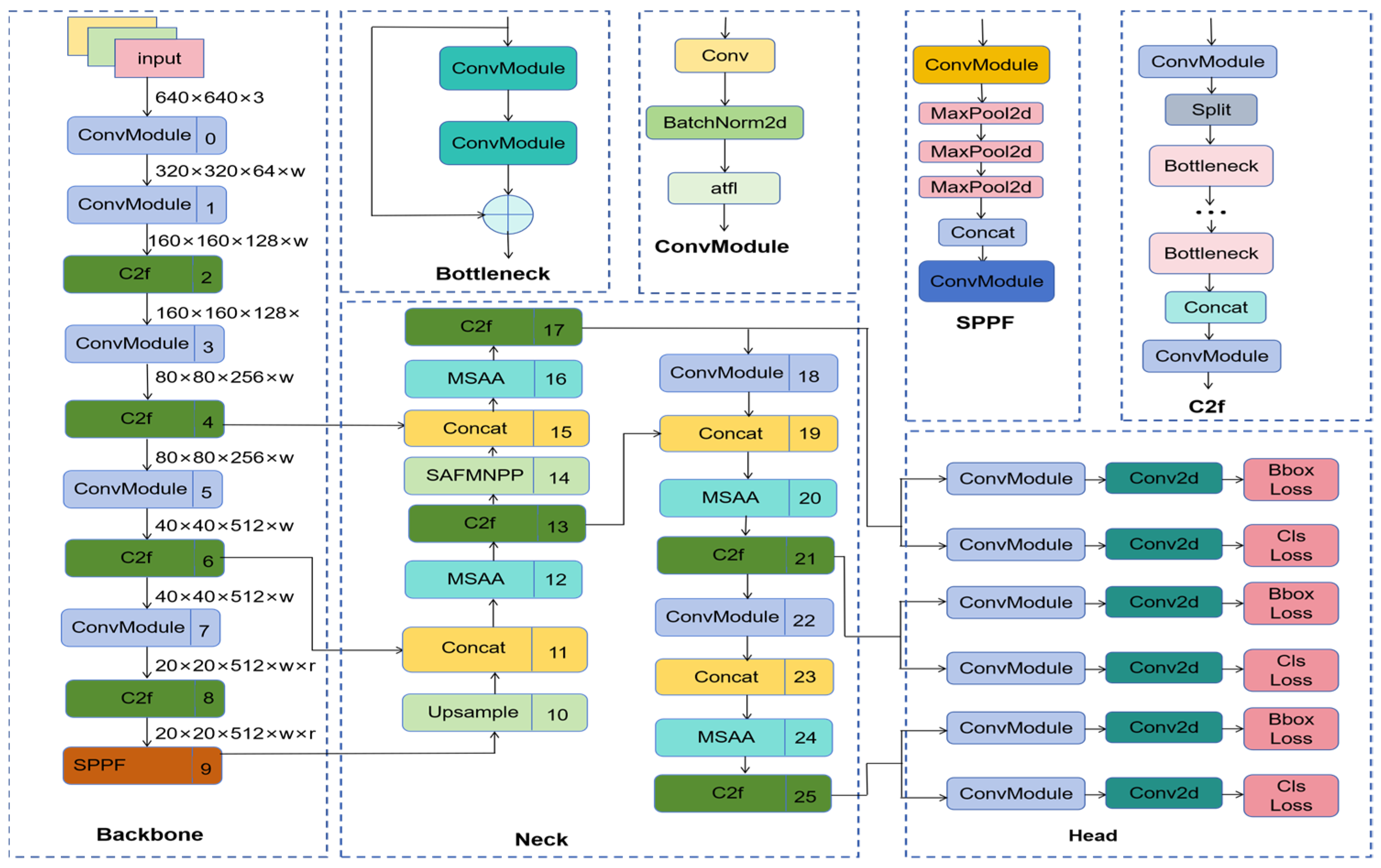 - To address the issue of weakened features for small targets against complex backgrounds, a Multi-Scale Attention Aggregation (MSAA) module is designed. In the spatial refinement path, multi-scale fusion helps retain fine-grained features of small objects, while the channel aggregation path enhances the model’s focus on channel information that is most relevant to the target. Together, these two mechanisms improve background suppression and effectively reduce interference from cluttered environments.