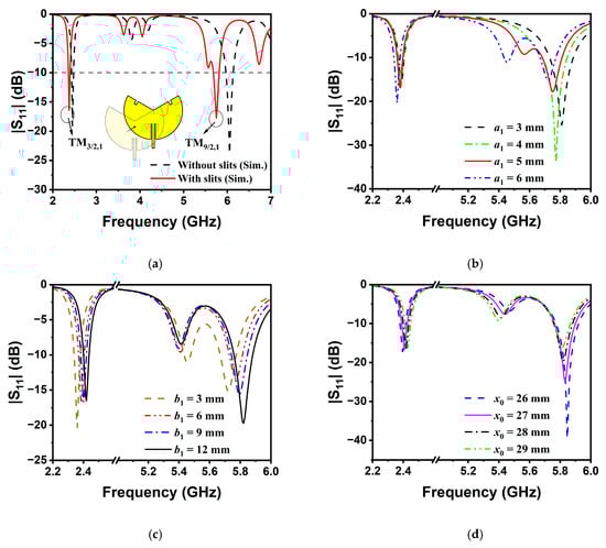 Figure 3a illustrates the wideband reflection coefficient frequency responses varying from 2 to 7 GHz for slit-loaded and unloaded antennas. In the initial step, the parameters of the slits are empirically chosen by the higher-order mode function [23,24,25], the dimension (i.e., a1 × b1) for the slit slots is chosen to be 5 × 3 mm2, and the position is set at x0 = 27 mm. It can be seen that the TM9/2,1 mode has been excited, perturbed, and tuned to the desired 5.8 GHz band by incorporating slits. The center frequencies of the TM3/2,1 and TM9/2,1 modes are 2.38 GHz and 5.76 GHz, respectively [21,26]. The effects of the most sensitive parameters of a1, b1, and x0 were numerically simulated and are shown in Figure 3b–d. It can be observed that the dual-band ratio is more sensitive to the slits’ length than their width and positions. Finally, the parametric studies yielded the values of all key parameters tabulated in Table 1.