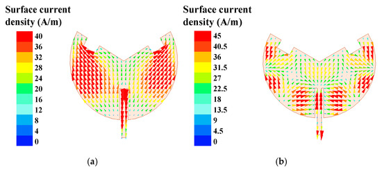 Simulation results for surface current density distributions: (a) 2.45 GHz and (b) 5.8 GHz.