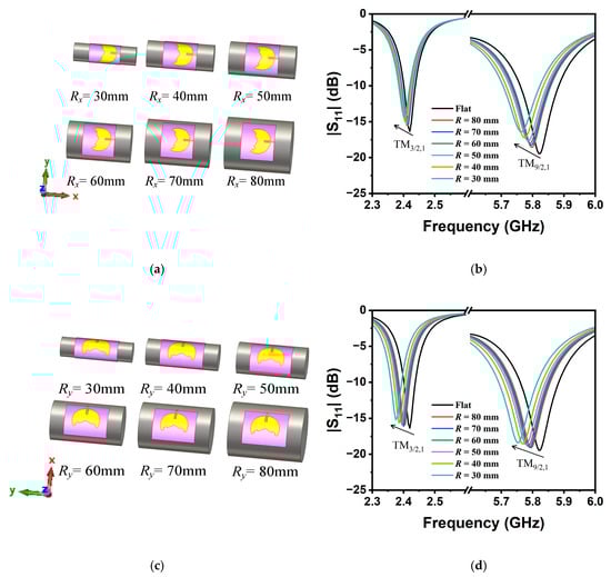 (a) The antenna bent at different radii along the x-axis; (b) simulated S11 plot at different bending radii; (c) the antenna bent at different radii along the y-axis; and (d) simulated S11 plot at different bending radii.