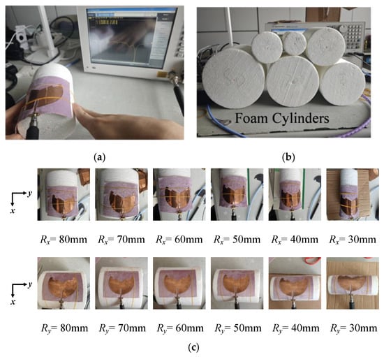 (a) Testing of bent sensing; (b) foam cylinders of different radii; and (c) the antenna is mounted on a foam cylinder and bent along the x-axis and y-axis.