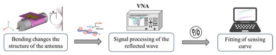 Then, the antenna was tested for bending. In the experiment, the textile antenna was fixed onto the foam cylinder using adhesive tape and rubber bands to emulate the conformal bending condition. The variations of |S11| in different bent cases were acquired by the VNA, as illustrated in Figure 7a. To ensure consistency with the simulation conditions, the radius of the foam cylinder was identical to that used in the simulation, as shown in Figure 7b,c. Finally, the measured data were fit and analyzed to yield closed-form sensing sensitivity formulas. A flowchart of the mechanical bent sensing studies is shown in Figure 8.