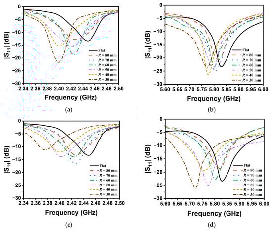 Measured |S11| on different bending radii: (a), (b) along the x-axis at 2.45 GHz and 5.8 GHz, respectively; (c), (d) along the y-axis at 2.45 GHz and 5.8 GHz, respectively.