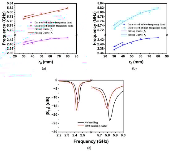 The experimentally measured |S11| curve is shown in Figure 9. The trend of the center resonant frequency shift matches the simulation results. It is seen that the frequency variation at 5.8 GHz under the TM9/2,1 mode resonance is more sensitive than the TM3/2,1 mode resonance at 2.4 GHz. When the bending radius is 30 mm, the maximum frequency shifts of the lower-order and higher-order modes are 75 MHz and 105 MHz, respectively. Moreover, a comparison between Figure 9a–d reveals that bending along the y-axis induces larger frequency shifts than the x-oriented case. The reason for this is that bending along the y-axis (perpendicular to the current direction) can more effectively disturb the structure and surface current path of the antenna, resulting in stronger sensing capability, whereas bending along the x-axis (parallel to the current direction) produces a weaker disturbance effect [21]. Excessive frequency shifts may potentially cause the resonant frequency point to fall outside the detectable ISM band. To suppress this effect, bending sensing can be selected along the x-axis direction.