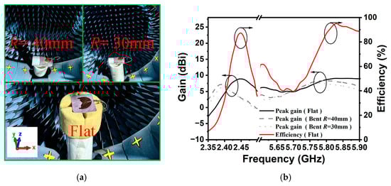 The radiation characteristics of the bent sensing antenna were measured in a Microwave Vision Group (MVG) Starlab anechoic chamber for both flat and different bending radius states (i.e., R = 40 mm and R = 30 mm), as shown in Figure 11a. As illustrated in Figure 11b, the measured results indicate that the proposed antenna achieves peak gains of 8.8 dBi and 9.1 dBi at the 2.45 GHz and 5.8 GHz ISM bands, respectively. In the bending situations, the gain at the high-frequency band remains nearly unchanged, while a slight reduction is observed at the low-frequency band. Furthermore, the radiation efficiency of the antenna sensor exceeds 50% across most operating bands when unbent, indicating that the bent sensing antenna meets the requirements for intelligent wearable devices.