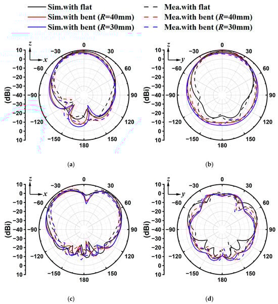 Simulated and measured results of far-field radiation from the zx-plane and zy-plane for flat and bent antennas at (a,b) 2.45 GHz and (c,d) 5.8 GHz.