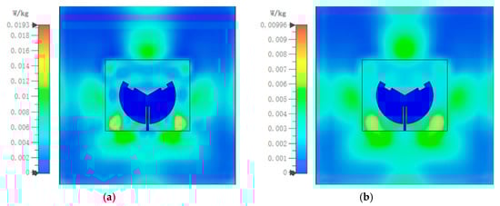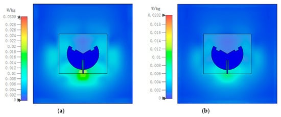 SAR limits: (a) 1 g at 5.8 GHz and (b) 10 g at 5.8 GHz (with an input power of 100 mW).
